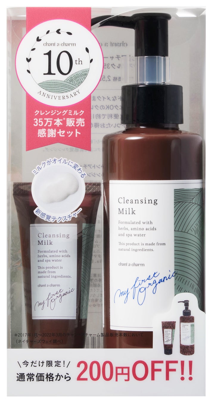 「チャントアチャーム 10周年記念 クレンジングミルク 35万本販売感謝セット」は、「クレンジングミルク」 (現品サイズ/130mL)と「クレンジングミルク ミニ」(20mL)がセットで、クレンジングミルク単品の通常価格から200円オフとお手頃価格。