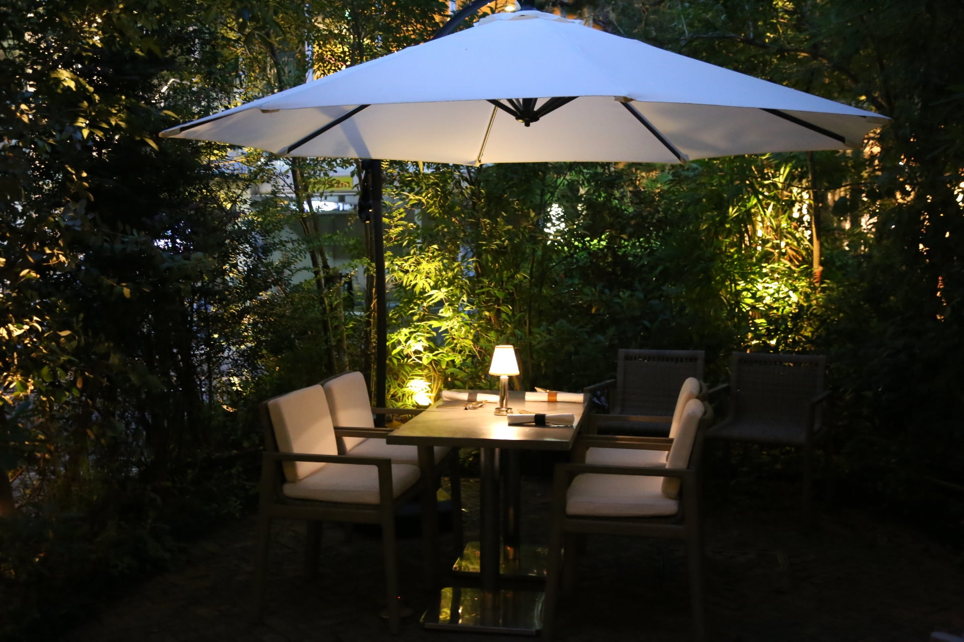 コースの内容は季節によって異なりますが、8月は「とうもろこしのすりながし」「鮎のリエット」「ノドクロの焼き物 葡萄の木の香り」「旬の魚の握り」など夏らしいメニューに加えて、メインは1階のダイニングのシグニチャーメニューである「黒毛和牛グリル 古代塩添え」を、デザートは南国のフルーツを使った「マンゴーとパッションフルーツのムース」を提供します。また、日本酒やワインなどソムリエが料理に合わせて選んだドリンクでペアリングも楽しめます。落ち着いたバー、華やかなメインダイニング、隠れ家のような地下の鮨処、そして緑豊かなオープンエアのテラスと雰囲気の変化を感じながら様々な料理を堪能できる、いつもとは一味違ったレストラン体験はいかがでしょうか。