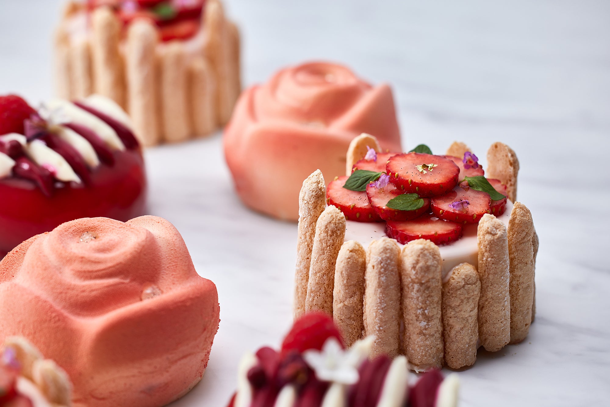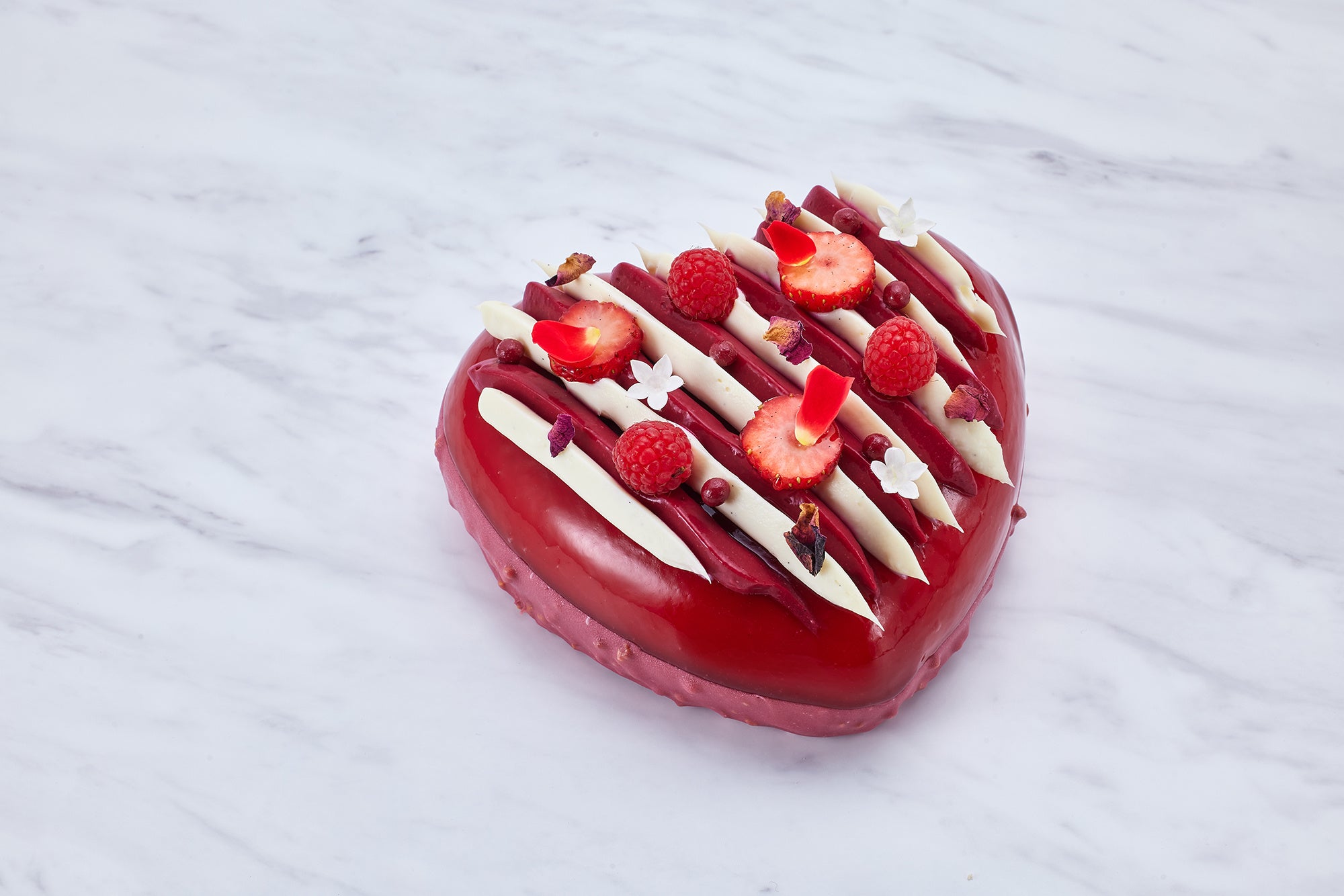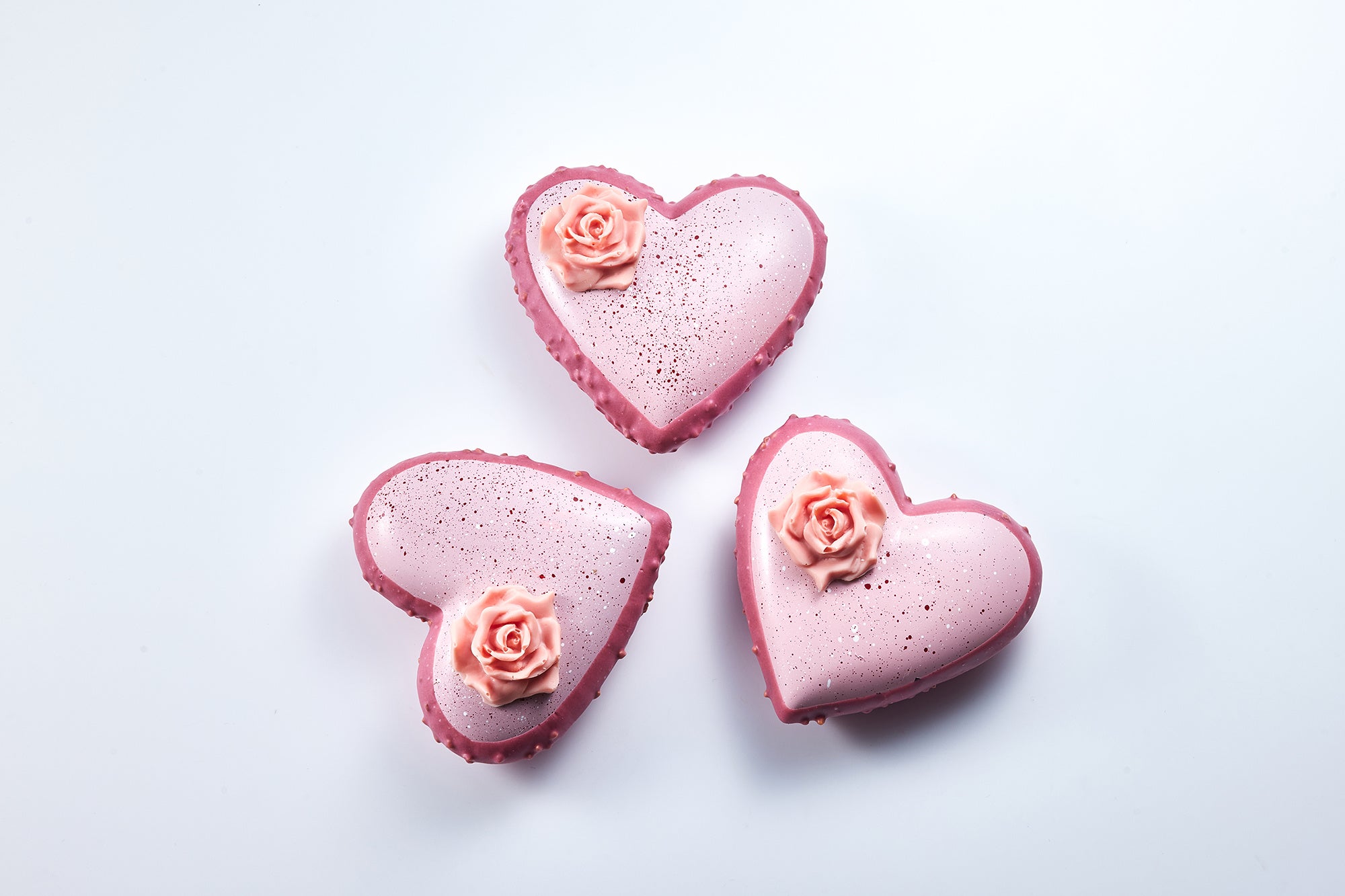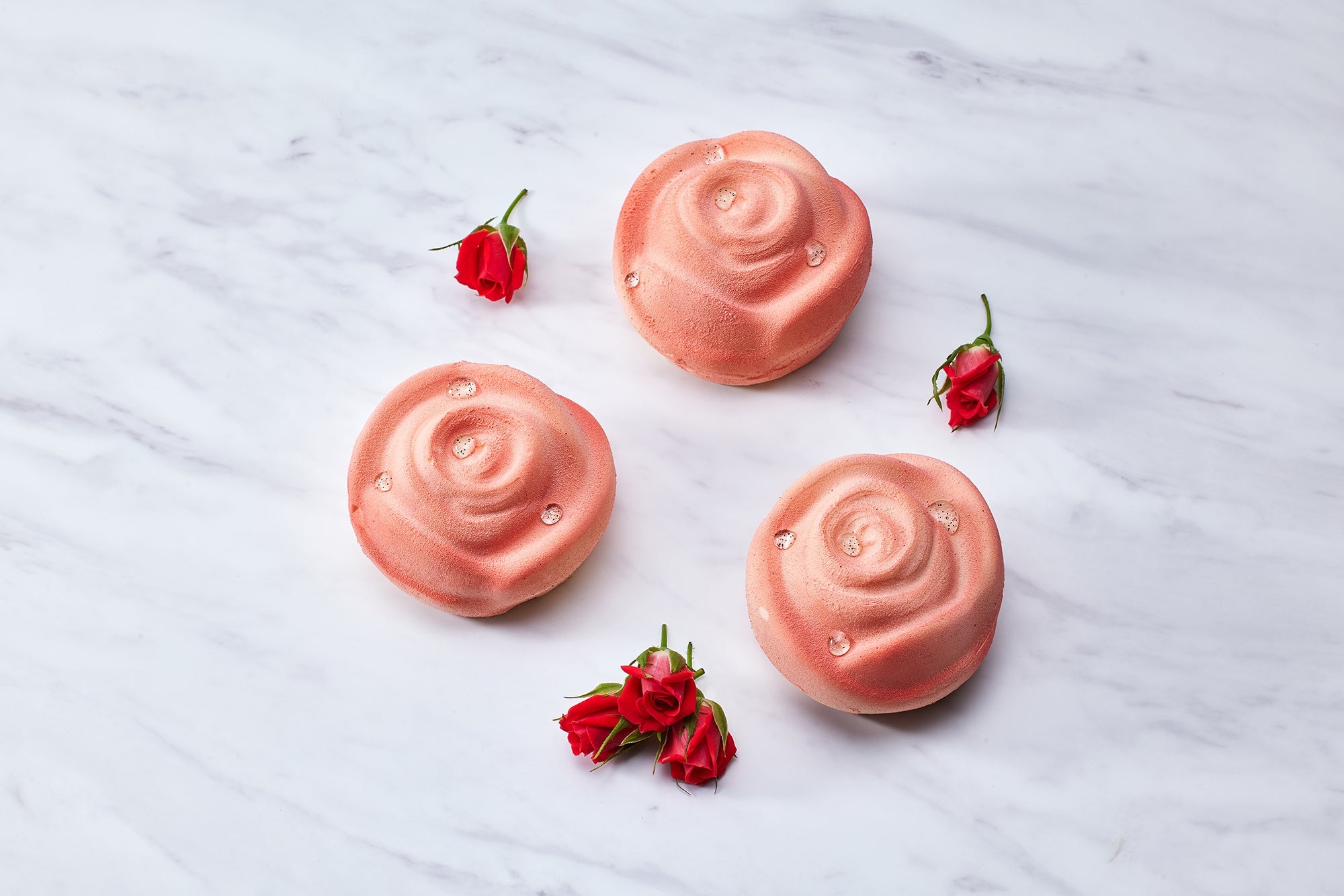 愛を伝えるバラのモチーフをほのかなピンクに染め、キュートに表現した新作スイーツ。ローズティークリームに、ラズベリージャムとヴィエノワスポンジをあわせ、ジャスミンティームースでつつんで。花々の香りにヘーゼルナッツクランブルの食感もプラスしつつ、甘味と酸味を絶妙なバランスで仕上げました。