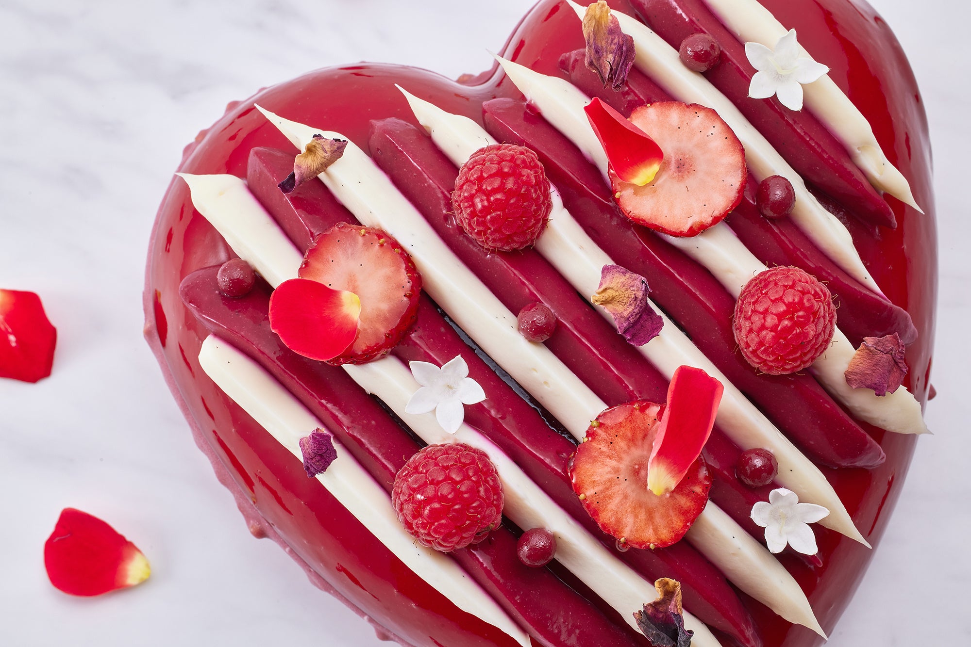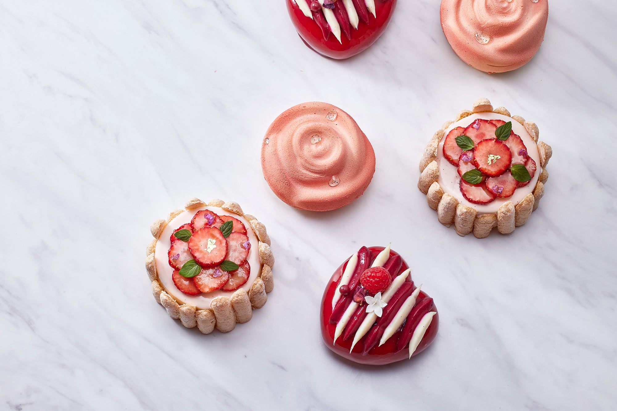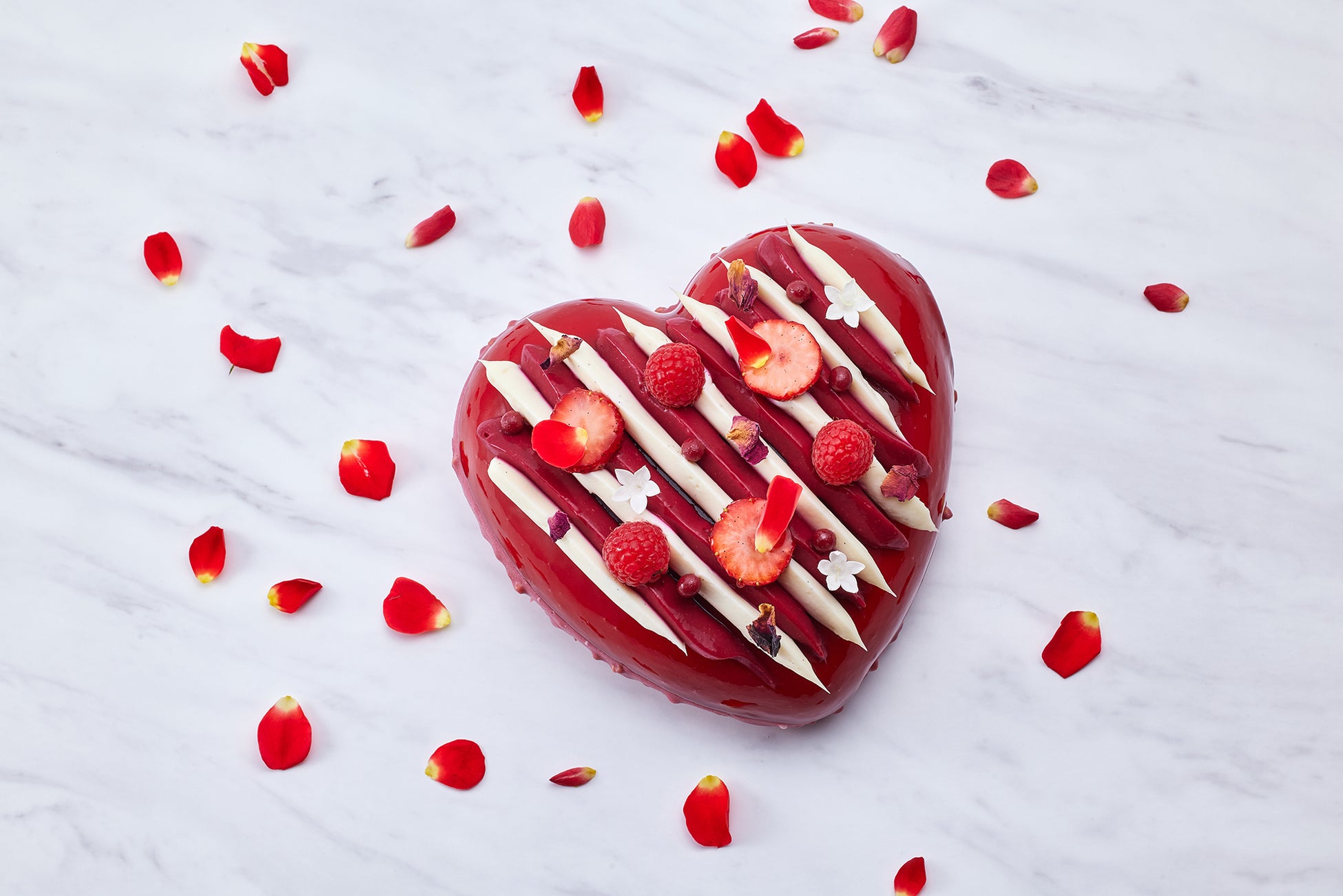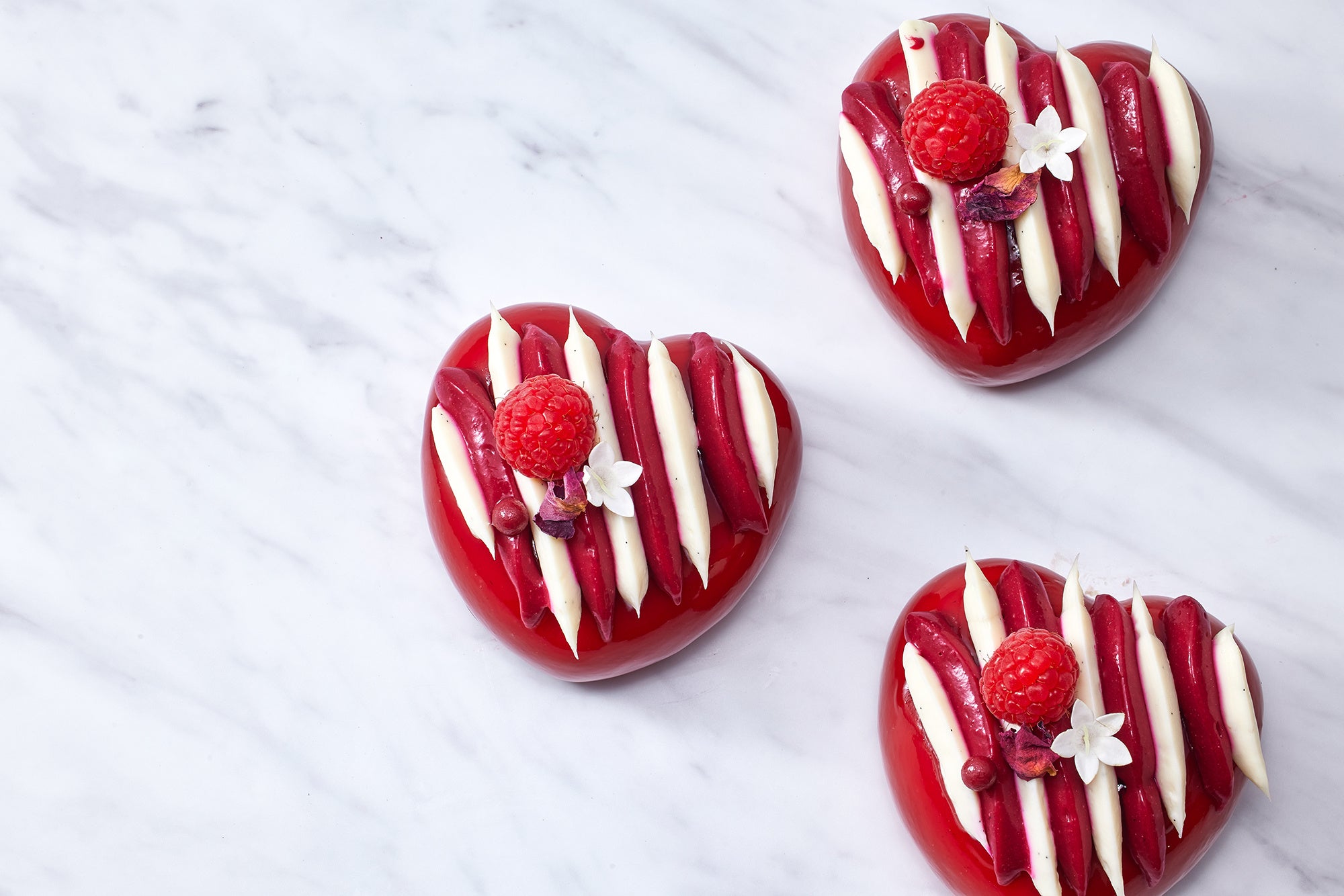 愛を伝えるバラのモチーフをほのかなピンクに染め、キュートに表現した新作スイーツ。ローズティークリームに、ラズベリージャムとヴィエノワスポンジをあわせ、ジャスミンティームースでつつんで。花々の香りにヘーゼルナッツクランブルの食感もプラスしつつ、甘味と酸味を絶妙なバランスで仕上げました。