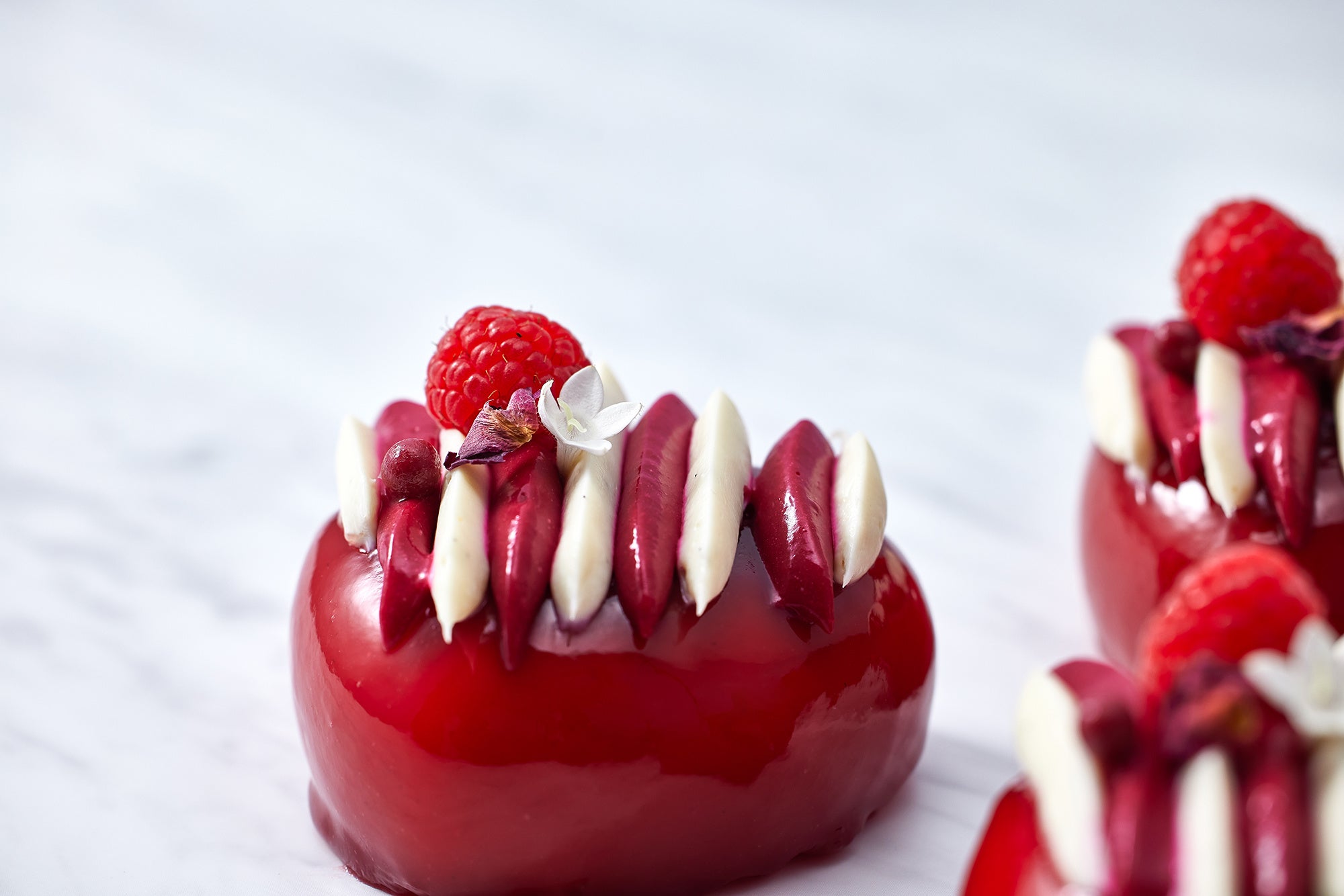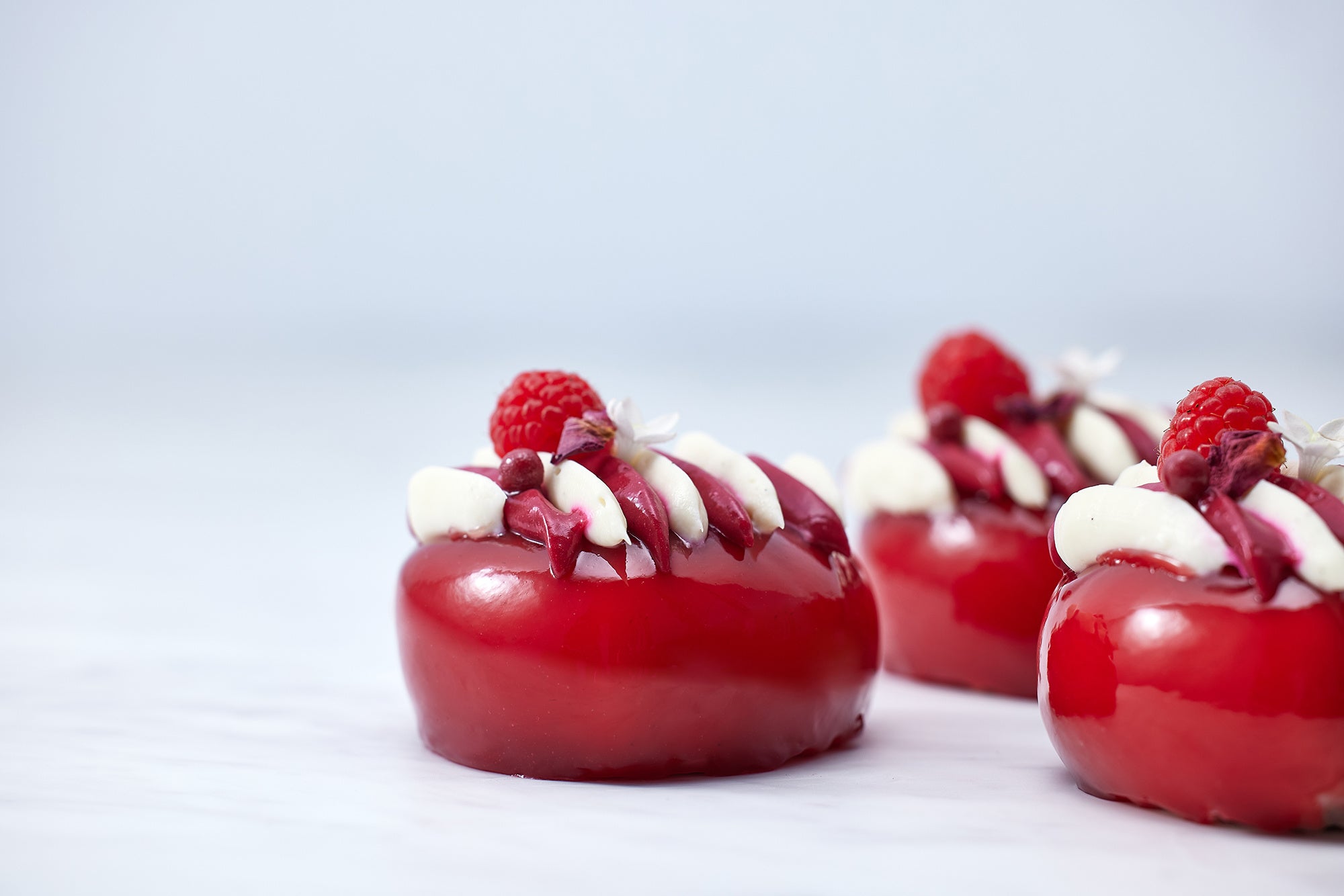 ビーツの色味を生かしたクリームとラズベリージャムを、フロマージュブランのバニラムースでつつみ、真紅のグレーズをかけて艶やかに。トップにはバニラクリーム、ビーツクリーム、苺とラズベリーでデコレーションをほどこしています。なめらかなバニラムースがビーツとラズベリーの爽やかな風味を引き立て、ピスタチオフィナンシェとチョコレートアーモンドグラッサージュのベースもアクセントとして利いています。