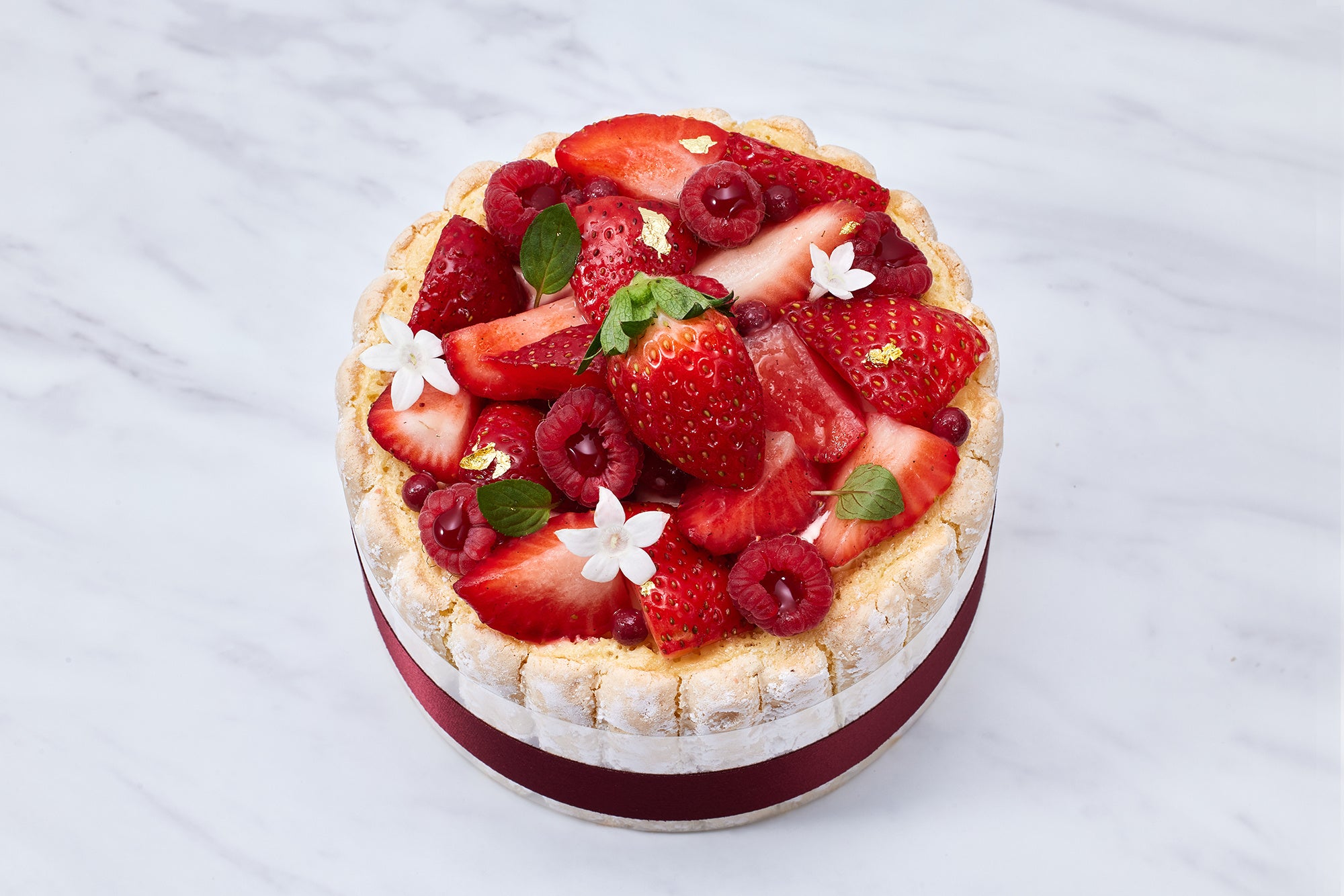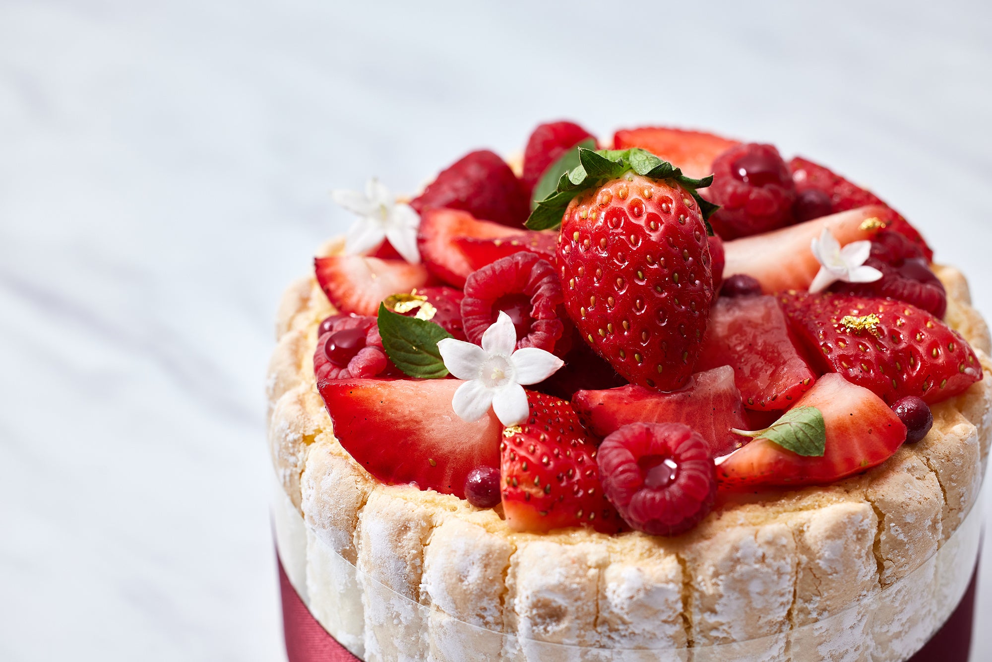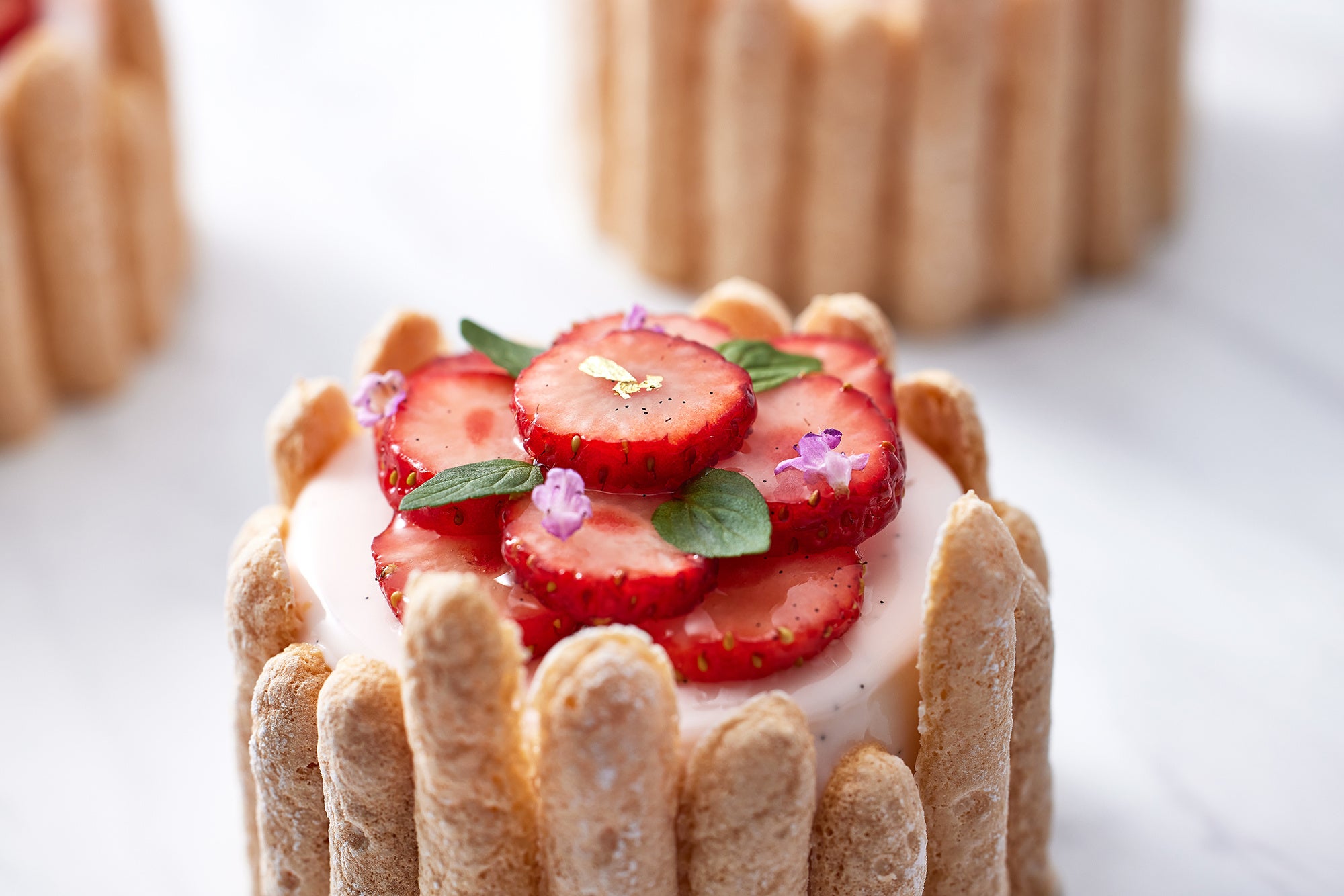 華やかなビジュアルのフランス伝統菓子「シャルロット」も、バレンタインスイーツとしておすすめです。バニラクリームの中には、苺のシロップを塗ったスポンジとストロベリージャムをひそませ、まわりにレディーフィンガースポンジを。みずみずしい苺をあしらい、ナチュラル感を生かしたビジュアルも好評です。
