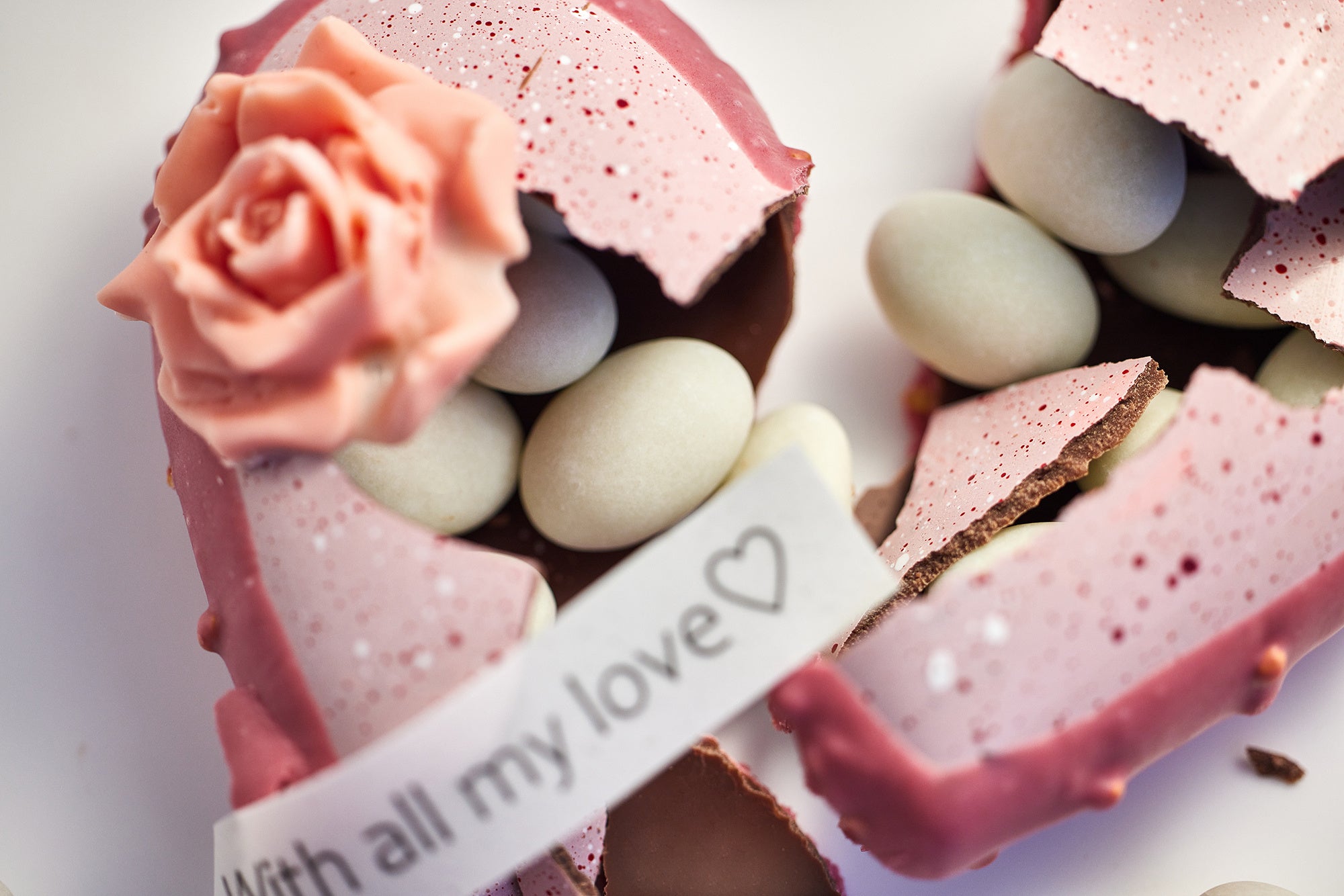 毎年好評のハートシェイプチョコレートを、今年は優しいピンクカラーでご用意します。木製ミニハンマーで割るアクションとともに、中から出てくるアーモンドドラジェもあわせてお楽しみください。ご希望によりメッセージを入れ、胸が高鳴るサプライズを演出することも。