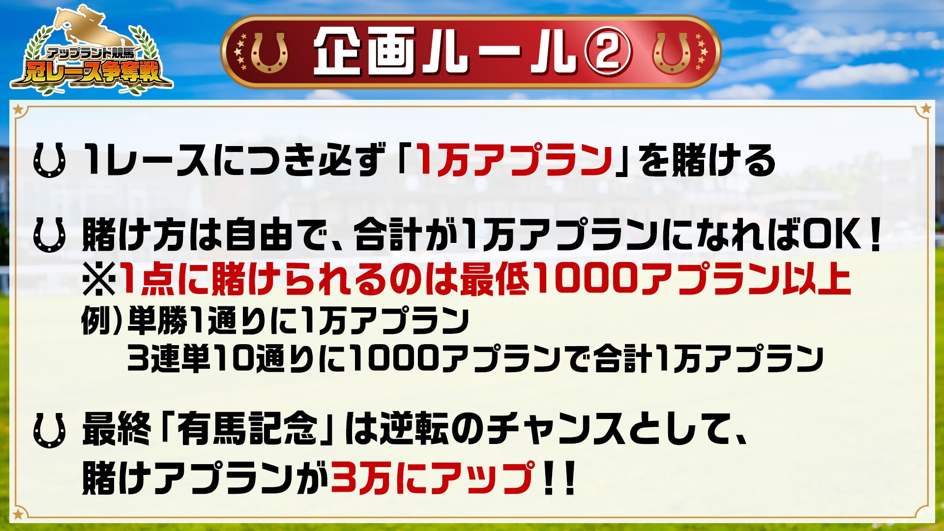 最終レース『有馬記念』終了後に合計アプランが最も多いメンバーが優勝となります!
