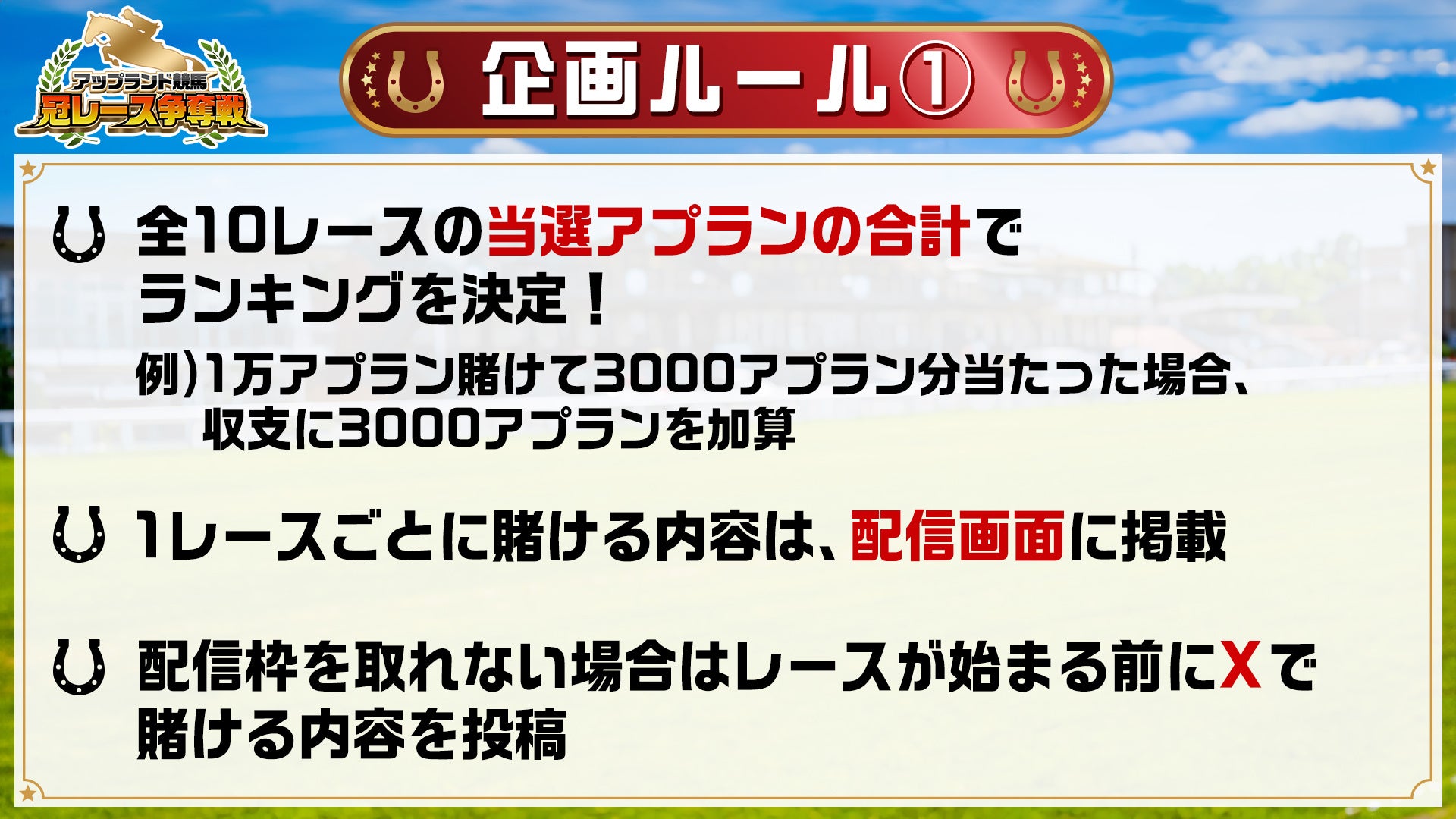 ・配信枠を取れない場合はレースが始まる前にXで賭ける内容を投稿。
