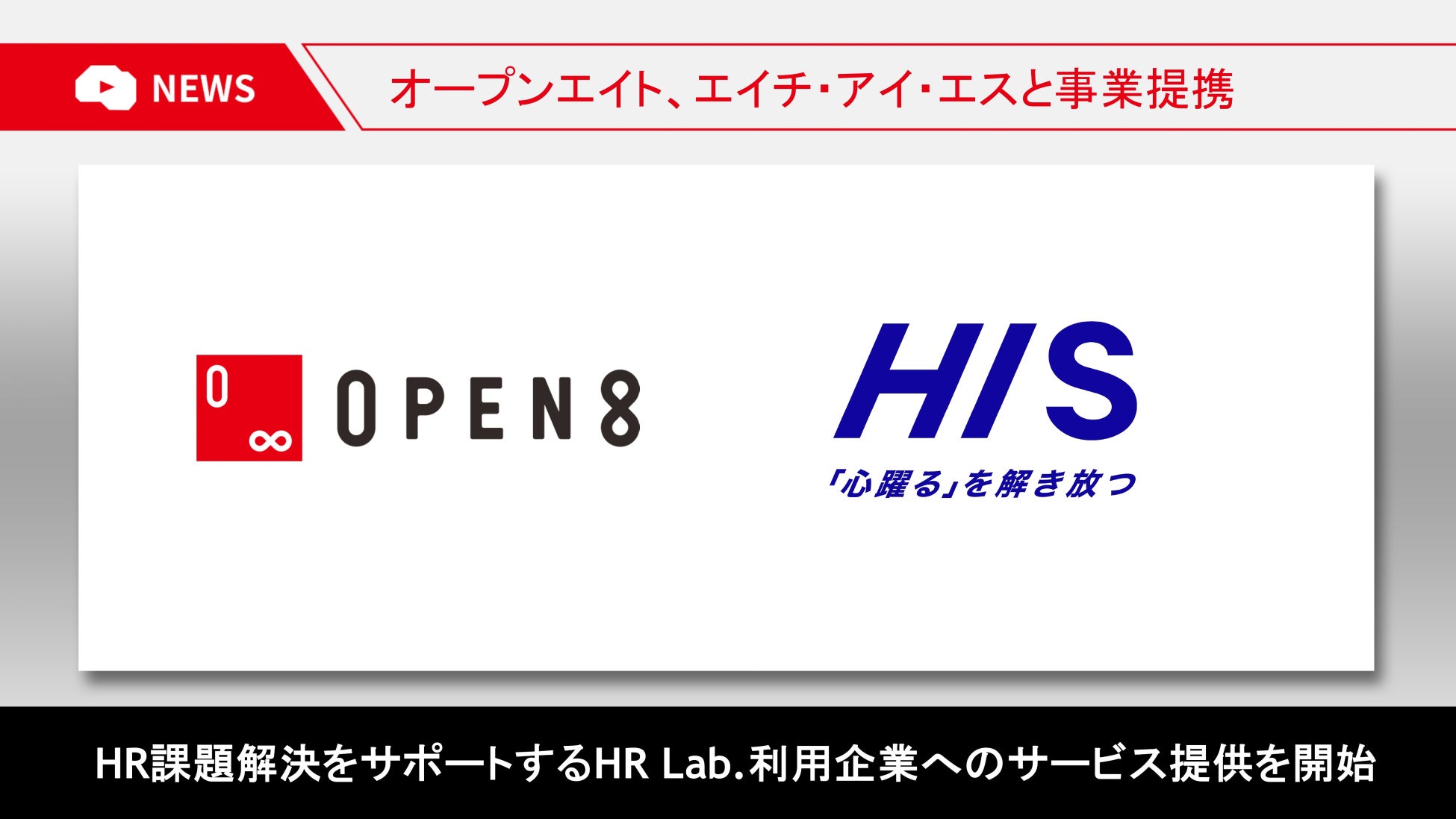 株式会社オープンエイト(本社:東京都千代田区、代表取締役社長兼CEO:髙松雄康、以下オープンエイト)と、オープンエイトの出資会社である株式会社エイチ・アイ・エス(本社:東京都港区、以下HIS)は、セールスチャネルの多様化の推進のため、セールスパートナー契約を締結し、HISが運営するHR領域の研究機関「HRLab.」の利用企業約500社に向けて、3年連続No.1シェア(※1) のAIビジネス動画編集クラウド「Video BRAIN」(ビデオブレイン)及びAIビジネス情報流通クラウド「Open BRAIN」(オープンブレイン)の提供を開始いたします。当該セールスパートナー契約を皮切りに、今後もHR領域のクライアントに協働で価値提案をしていくことを模索いたします。