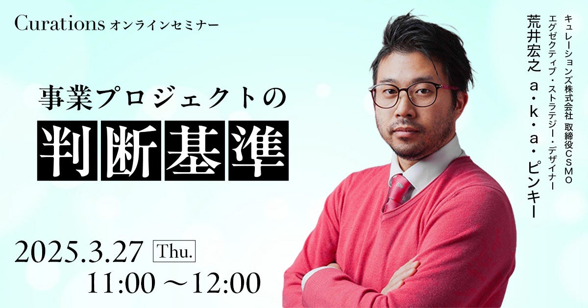 顧客企業のビジネス変革を成功に導くキュレーションズ株式会社(本社:東京都渋谷区、代表取締役社長:根本隆之、以下当社)は、『事業プロジェクトの判断基準』を2025年3月27日(木)に開催いたします