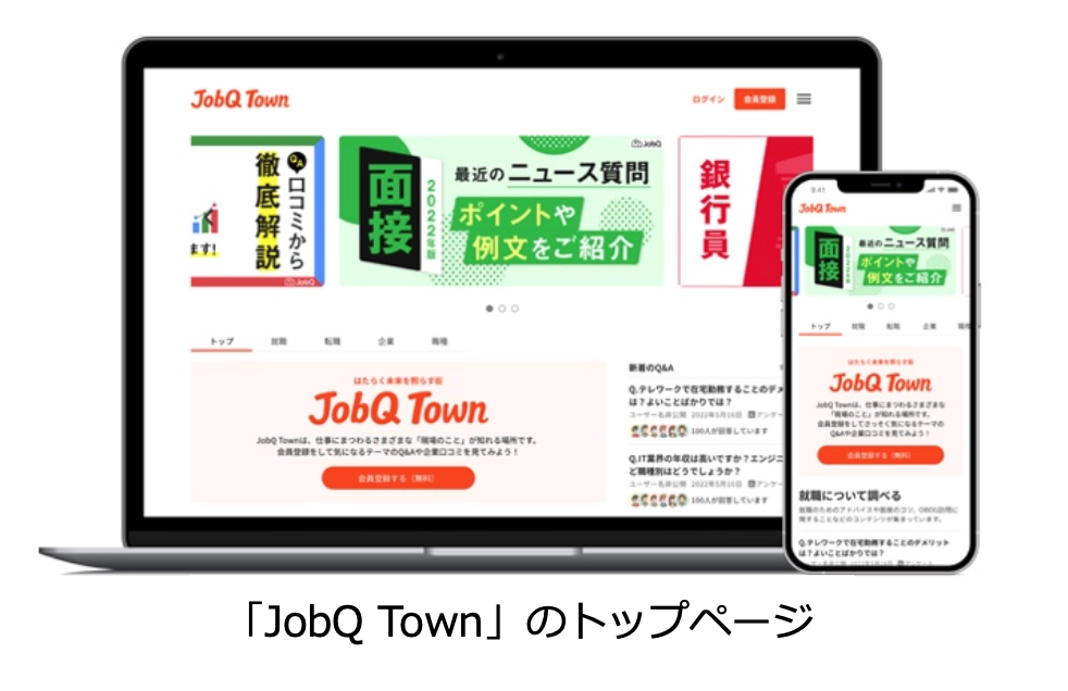 「あなたが知りたい”働く”は誰かが知っている」をコンセプトに運営するJobQ Townの累計登録者数は40万人を超え、キャリアや転職に関する情報交換と相談ができる匿名サービスです。具体的な企業名を検索して、現役社員や元社員による口コミだけではなく、仕事全般に関する悩みや就職・転職への不安など漠然とした内容も含まれ、匿名のユーザー同士でコミュニケーションを取りながら、より良い選択を創る場になっています。