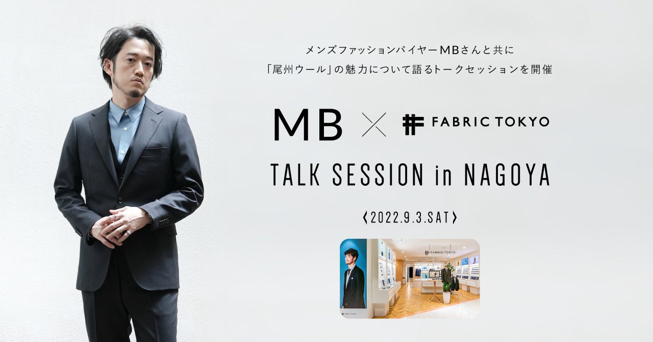 株式会社FABRIC TOKYO(本社:東京都渋谷区、代表取締役CEO:森 雄一郎)は、ファッションアドバイザーMBさんとコラボレーションした新作「MBハイエンド尾州ウール for FABRIC TOKYO」の発売にあわせ、FABRIC TOKYO 名古屋栄にて入場無料のイベント「MB×FABRIC TOKYO TALK SESSION in NAGOYA」を開催します。