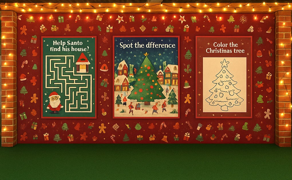 「Kids Area(キッズエリア)」の一部には人工芝を設置し、お子さまが普段公園に遊びに来たときのように体を動かして遊べる空間を作り出します。壁面には「サンタの家までたどり着く迷路」「間違い探し」「サンタクロースを探せ!」など、つい遊びたくなる仕掛けを掲示予定。