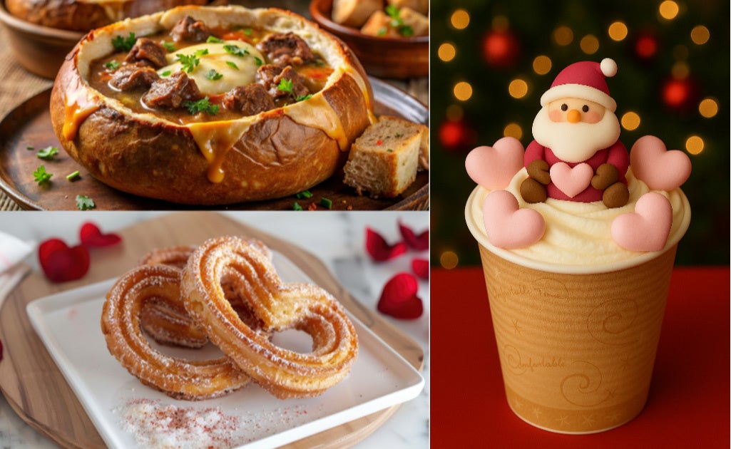 「Hutte Town Area (ヒュッテタウンエリア)」には20店舗が出店し、バラエティ豊かなグルメを提供予定です。中でも注目はクリスマスマーケットの歴史が長いドイツ・フランクフルトの「フランクフルター・シュニッツェル」や、ハート型のチュロス、冷えた体を温めて器まで美味しく食べられるバケットボウルのビーフシチューなど、クリスマスムードを盛り上げるグルメが勢揃いします。また、店舗ごとに個性あふれるクリスマスキャラクターが乗ったココアが登場します。