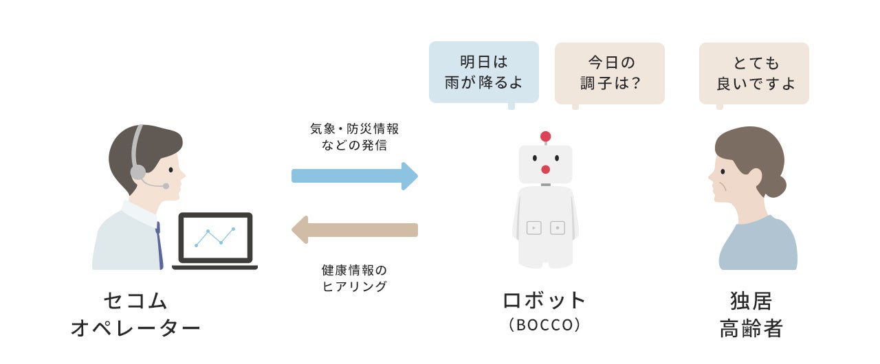 具体的には、高齢者宅内に設置したコミュニケーションロボット「BOCCO」(ボッコ)を介して気象・防災情報や、森之宮病院からの健康や医療に関する情報を含め、セコムのオペレーターからの情報提供や健康状況などの確認です。また、近隣のコンビニエンスストアで日用品の注文や配達などの買い物補助のサービスを行いました。(詳細は後述参照)