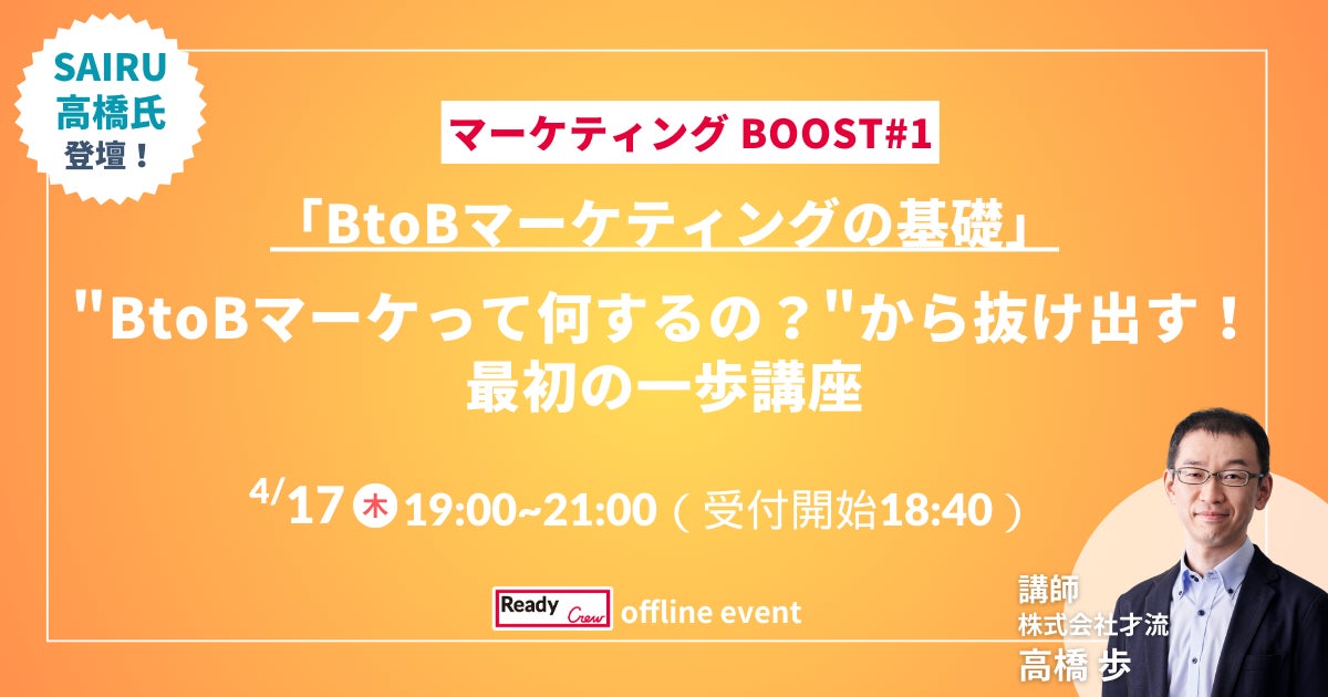 ビジネスマッチングサービス「Ready Crew(レディクル)」を運営する、フロンティア株式会社(本社:東京都渋谷区、代表取締役社長:高橋 政裕、以下 当社)は、2025年4月17日(木)に、「マーケティングBOOST #1『BtoBマーケの基礎編』」を開催いたします。