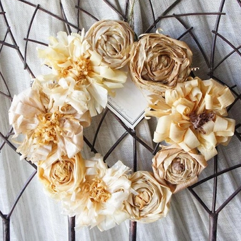 家具づくりで出るカンナくずをリボンのように束ねて花の形にしたリース。木の香りが漂い、インテリアに映える美しさ。