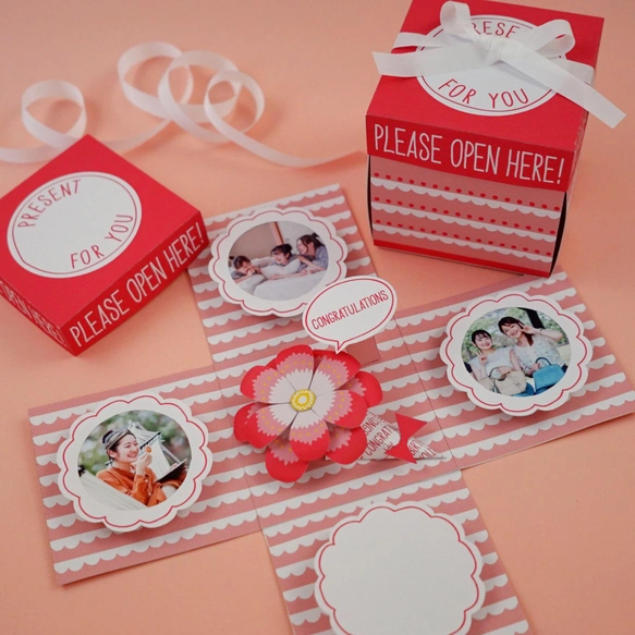 開くとメッセージと写真が飛び出す箱。思い出の写真とともに送れば嬉しいギフトになります。