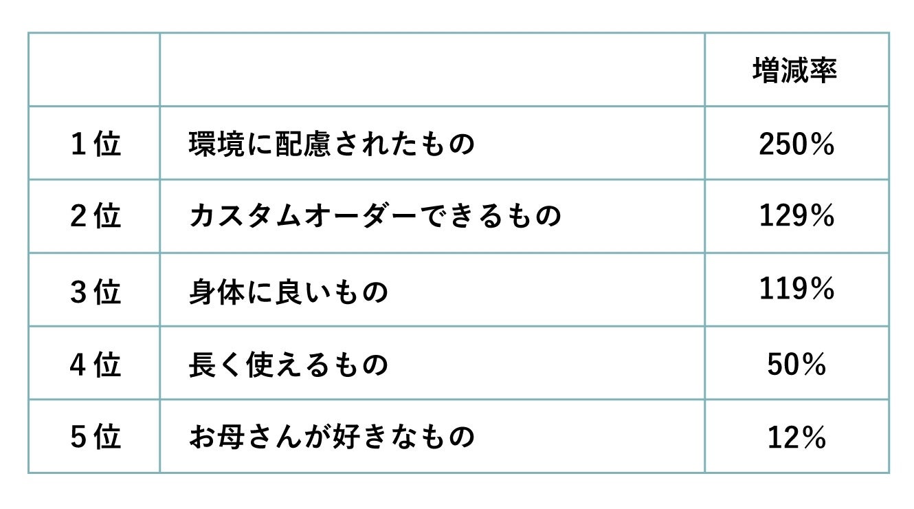 今年のトレンドは、“サステナブル”なアイテムでお母さんの好みに合わせてオリジナルに“カスタマイズ”できる、“サステナマイズ”なギフトという結果が見えてきました。レジ袋有料化や今月施行されたプラスチック資源循環促進法に伴う世の中の変化に加え、様々な環境問題に対する意識の高まりが、ギフト選びにも影響を及ぼしているようです。