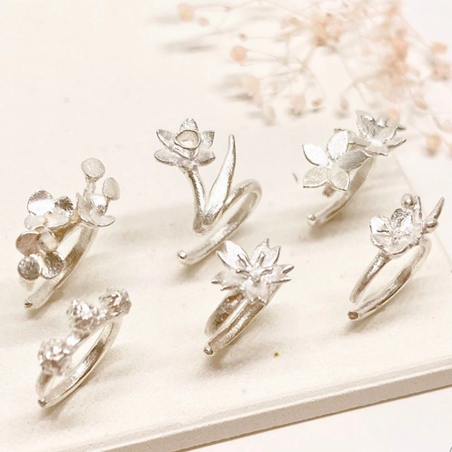 使われなくなった銀製品や廃フィルムをリサイクルした素材から作られています。好きなお花モチーフを選んで。