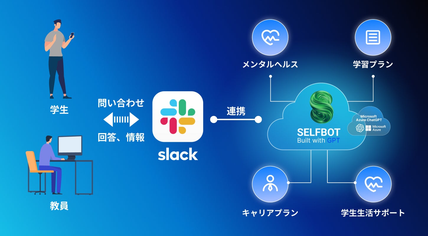今回新たに導入する次世代の高精度チャットボット「SELFBOT」は、生成AIのChatGPTと連携しており、回答の元となるドキュメントやURLから自動学習させることができるため、教職員が質問や回答を考える手間が省けるうえに、より高度で柔軟な回答が可能となります。これによって、学生からの問い合わせ対応をさらに効率化し、窓口対応の負担を軽減することを目指しています。また、教職員の業務においてもチャットボットによるサポートを強化し、業務効率化を図ります。