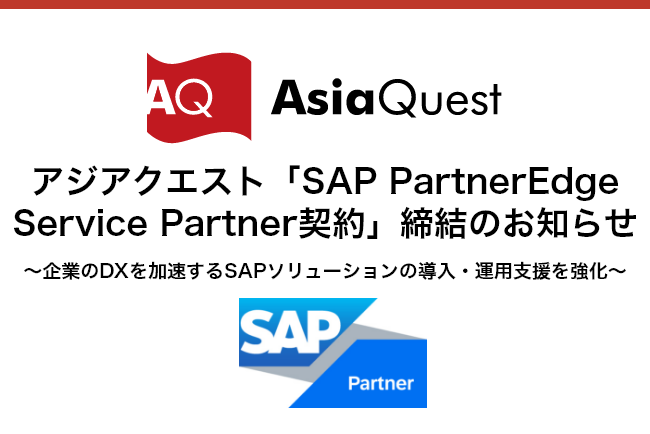 アジアクエスト株式会社(本社:東京都文京区、以下 アジアクエスト)は、SAPジャパン株式会社(本社:東京都千代田区、代表取締役社長:鈴木 洋史、以下SAPジャパン)と「SAP PartnerEdge Service Partner契約」を締結し、SAPジャパン株式会社が提供するパートナープログラムに正式加入したことをお知らせいたします。