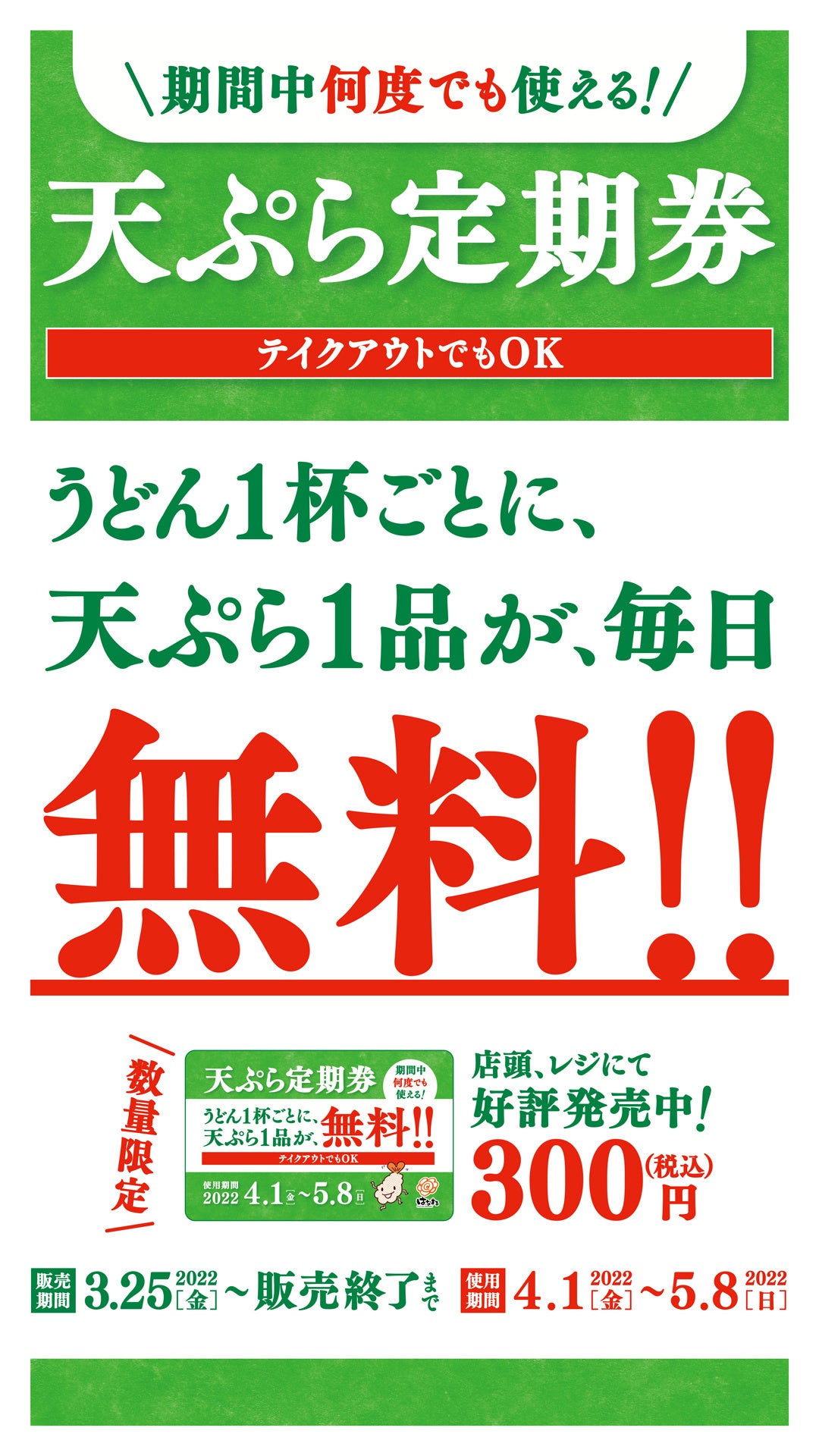 | 内 容 | 1回のお会計につき、お好きなうどん、定食、カレーライス(単品)、ミニ丼(単品)、テイクアウト弁当、いずれか1品ごとに、お好きな天ぷら1品が無料となります。 テイクウトでもご利用いただけます ※他のキャンペーンサービス、割引、クーポンと併用いただけません ※プレミアム定期券、株主優待券と併用いただけます ※各種デリバリーサービス、モバイルオーダーではご利用いただけません |