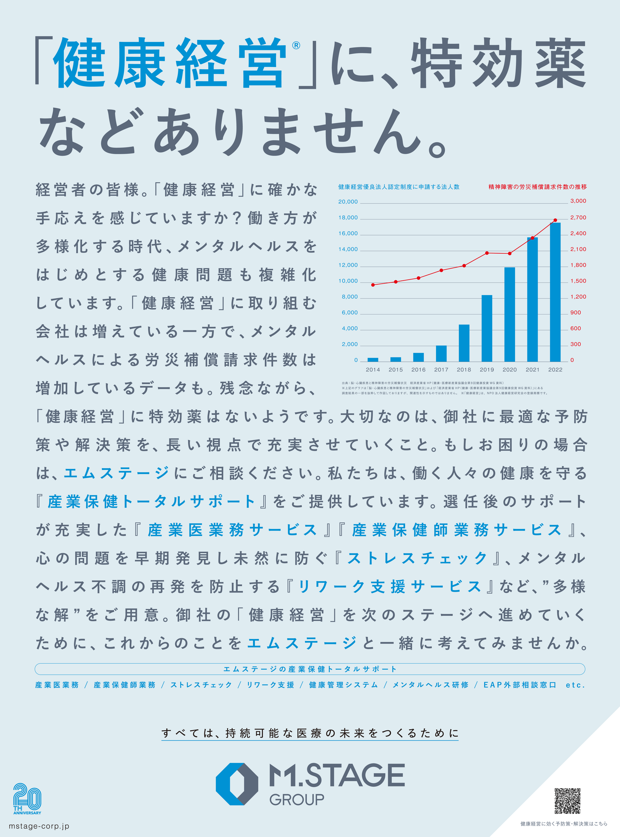 この度、エムステージは、エムステージグループ創業20周年を記念した新聞広告第二弾を、2023年11月上旬の日本経済新聞に掲載いたします。働き方が多様化する現代において、多様化・複雑化が進む企業が対応すべき「健康経営®」の課題に“多様な解”を提供していく思いを言葉にしました。