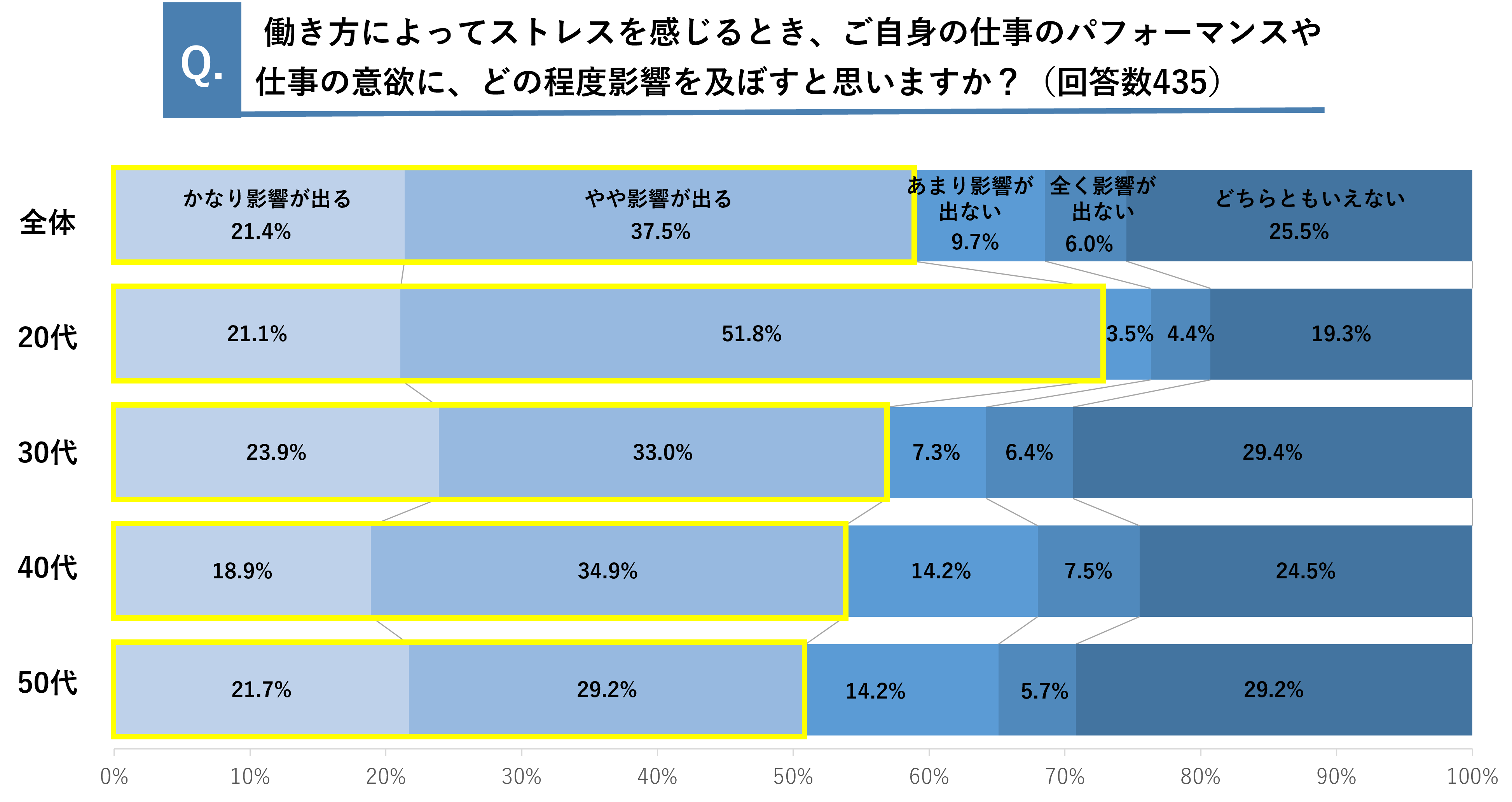 働き方によってストレスを感じるとき、21.4%が自身の仕事のパフォーマンスや仕事の意欲に「かなり影響が出る」、37.5%が「やや影響が出る」と回答。約6割が働き方によるストレスが仕事のパフォーマンスや仕事の意欲に影響が出る結果となりました。年代別では、20代が約7割で最も影響が出る結果となりました。