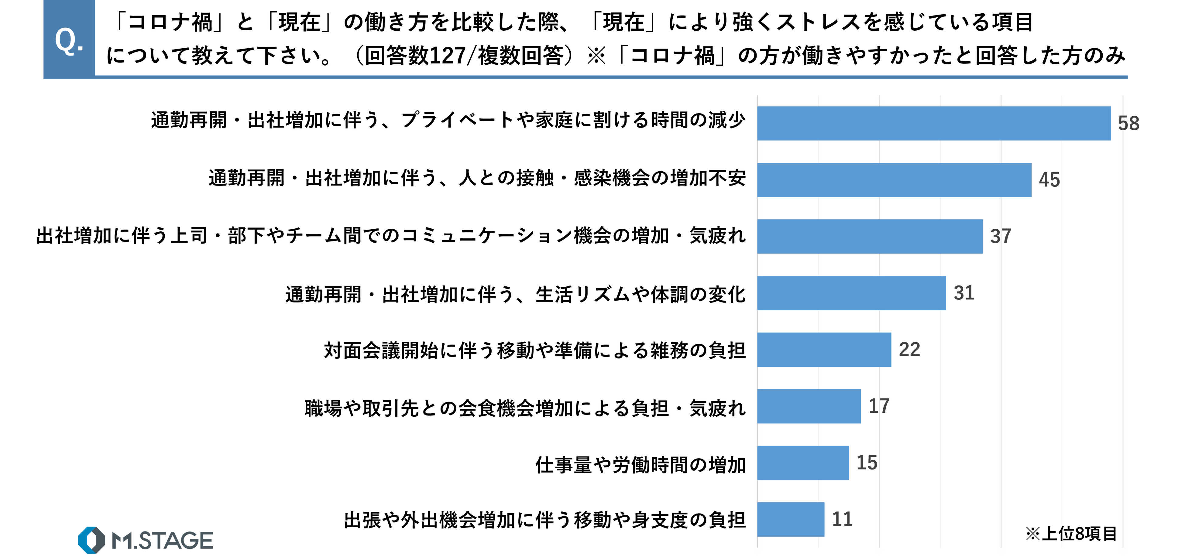 「コロナ禍」の方が働きやすかったと回答した人が、「現在」の働き方により強くストレスを感じている項目は、「通勤再開・出社増加に伴う、プライベートや家庭に割ける時間の減少」(58)が最も多く、次いで「通勤再開・出社増加に伴う、人との接触・感染機会の増加不安」(45)、「出社増加に伴う上司・部下やチーム間でのコミュニケーション機会の増加・気疲れ」(37)となりました。