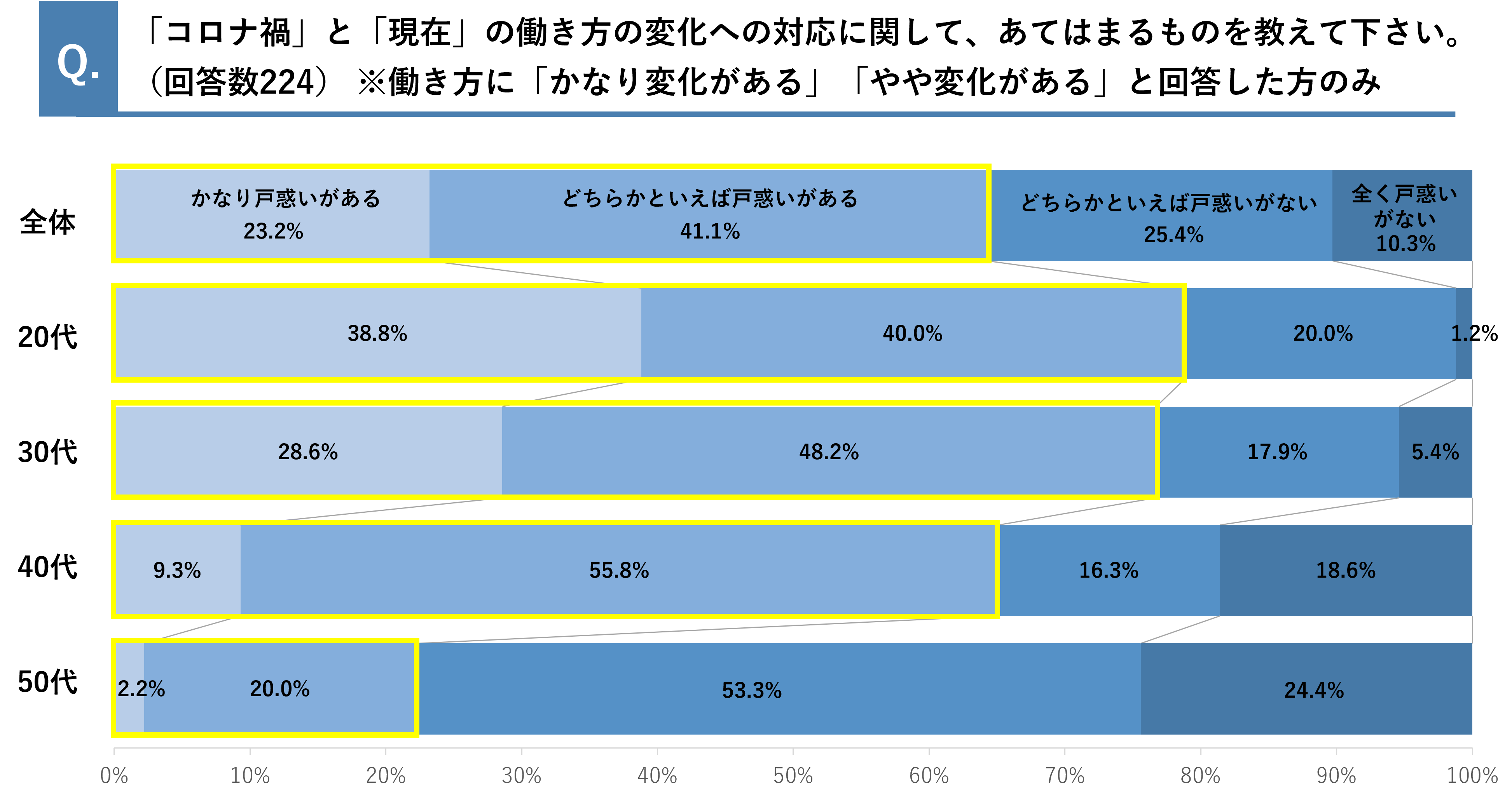 「コロナ禍」と「現在」の働き方の変化への対応に関して、23.2%が「かなり戸惑いがある」41.1%が「どちらかといえば戸惑いがある」と回答。3人に2人が働き方の変化に戸惑いを感じている結果となりました。また、年代別でみると20代、30代の約8割が戸惑いを感じている結果となりました。