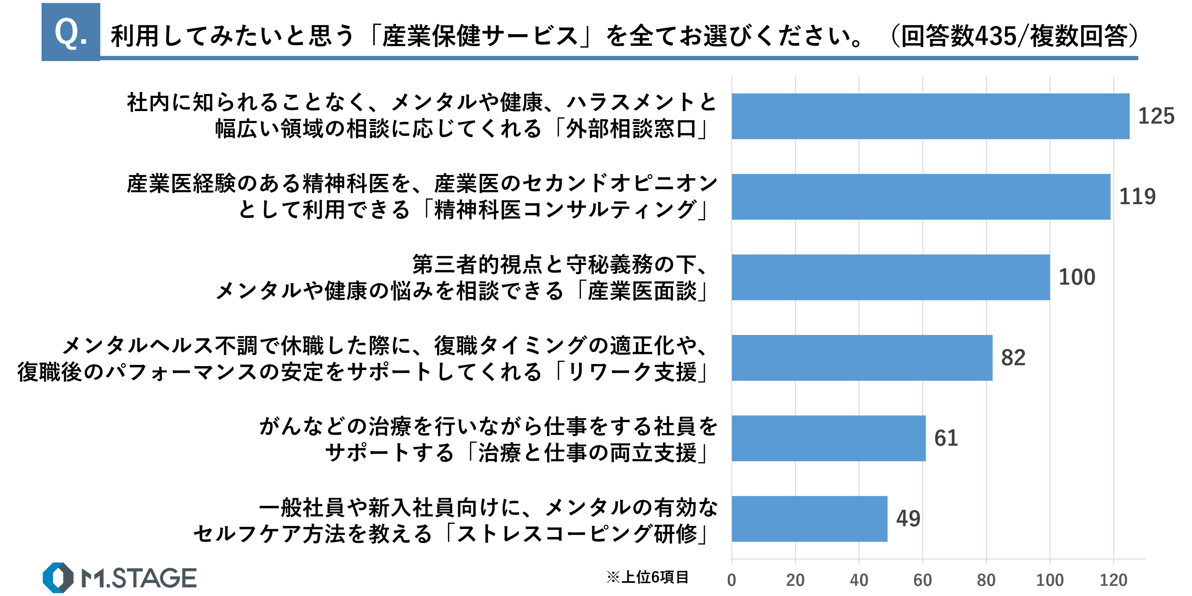 利用してみたいと思う「産業保健サービス」に関して、社内に知られることなく、メンタルや健康、ハラスメントと幅広い領域の相談に応じてくれる「外部相談窓口」(125)が最も多く、次いで「精神科医コンサルティング」(119)、「産業医面談」(100)、「リワーク支援」(82)、「治療と仕事の両立支援」(61)、「ストレスコーピング研修」(49)が続きました。