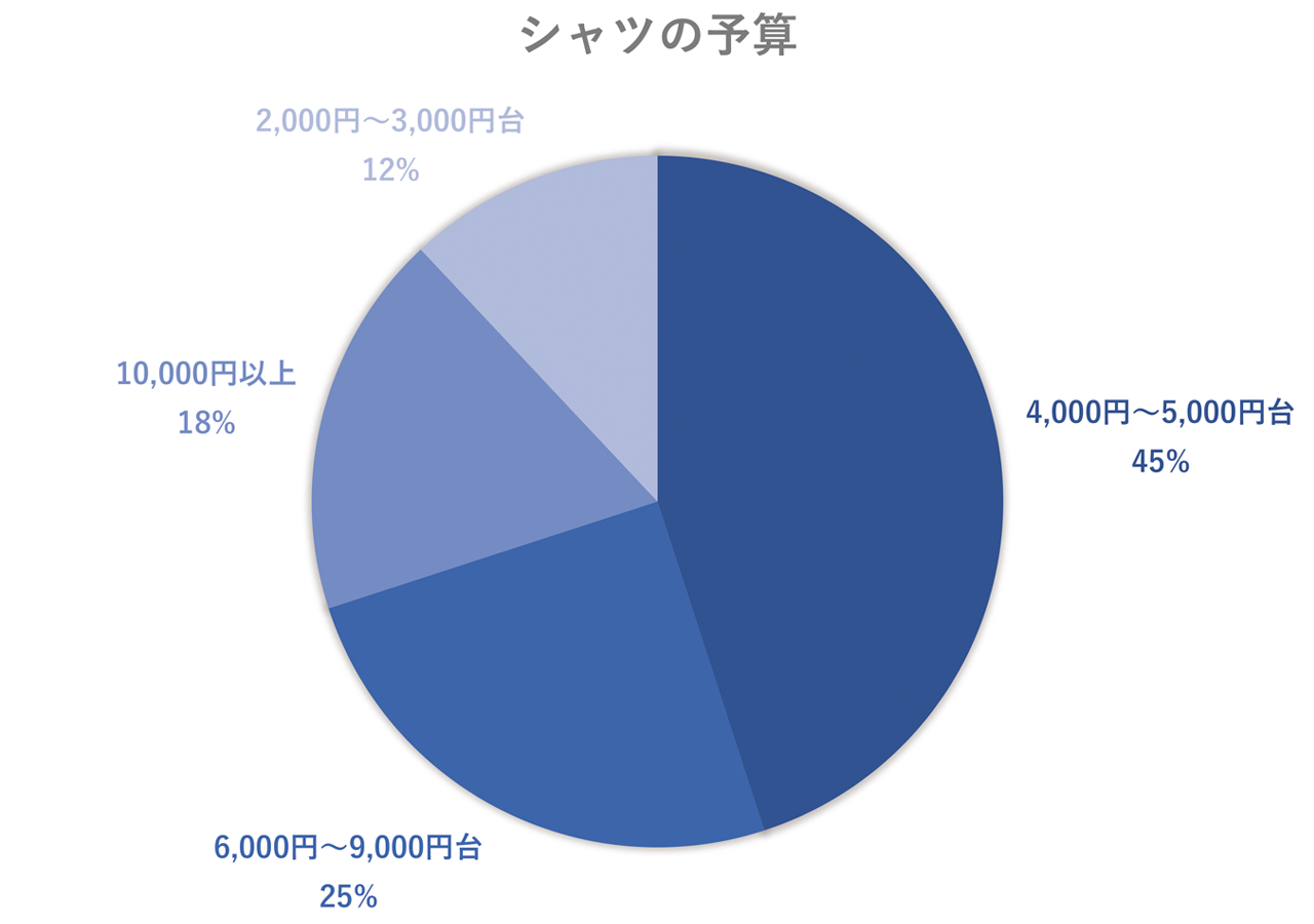 シャツの予算は、44%が「4,000円~5,000円台」、25%が「6,000円~9,000円台」18%が「10,000円以上」、12%が「2,000円~3,000円台」という結果になりました。