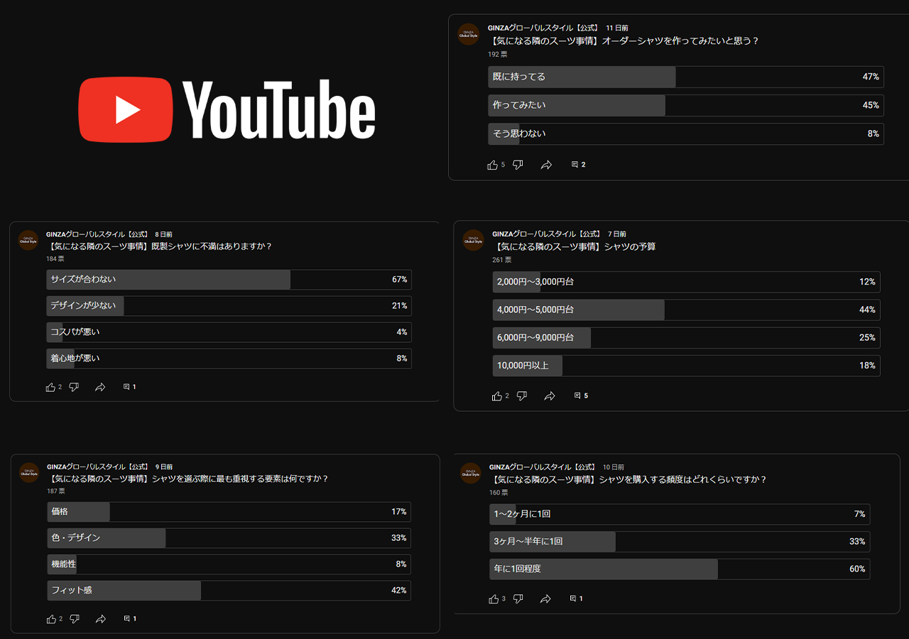 ・調査方法(集計方法、算出方法):オーダースーツ専門店「GINZAグローバルスタイル」のYoutube公式アカウントでアンケートを実施。