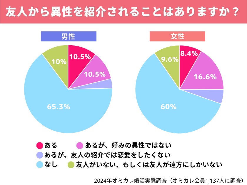 しかし、男女共に約7割が、友人から異性を紹介されることが「なし」もしくは「友人がいない・友人が遠方にしかいない」と回答。