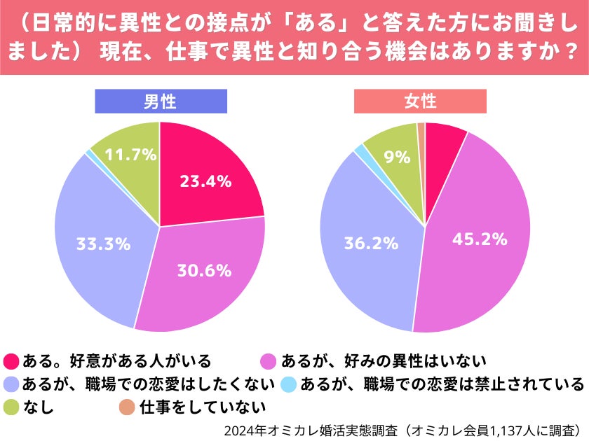 また、男性は、「職場で異性と知り合う機会があり、好意がある人がいる」と回答した人が23%以上と、女性に比べてかなり多い結果に。