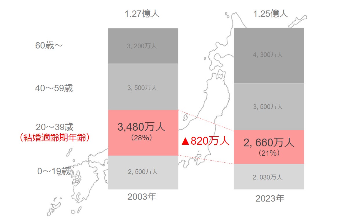 結婚適齢期とされる20~39歳の人口は、2003年から2023年の20年間で、なんと約820万人も減少。