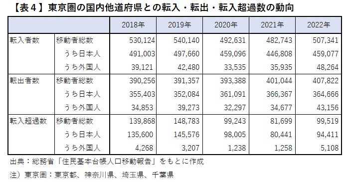 東京圏(1都3県)の転入・転出状況をみると、2022年の転入者数は50万7341人、転出者数は40万7822人であり、9万9519人の転入超過となっています。2021年の転入超過数8万1699人から1万7820人増加し、2020年時点の状況まで回復していることが分かります【表4】 。