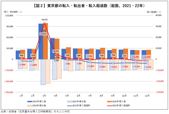 月別にみると、3月に3万3171人、4月に4373人の大幅な転入超過となり、7 、11、12月の3カ月を除き、転入超過の月が続きました。2021年のように年後半に毎月3000~4000人程度の転出超過が続くという状況は脱したと言えそうです。
