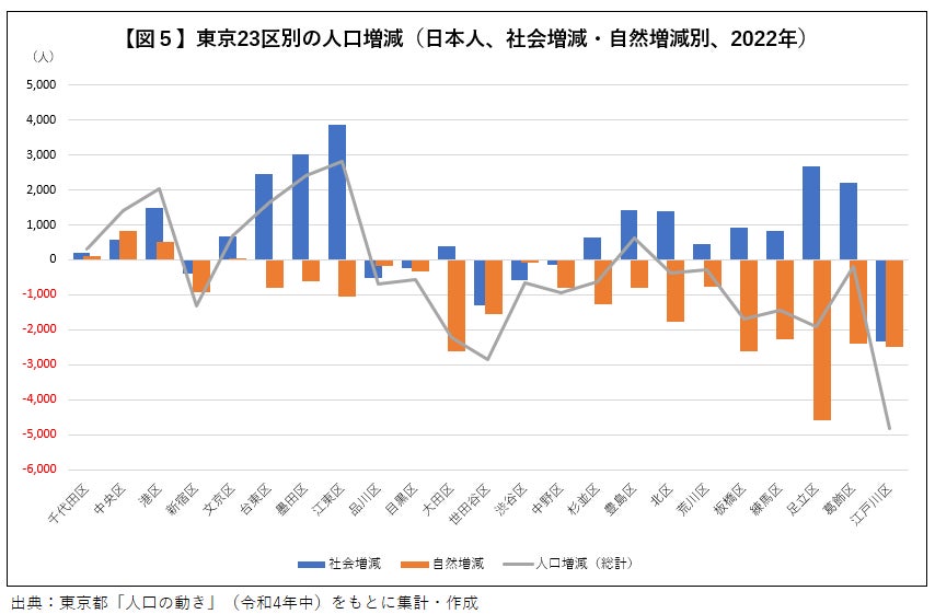 また、足立区、葛飾区は大幅な社会増となっているものの、自然減が大きく目立っていることから、結果的に人口増減数がマイナスとなっています。この2区では年齢構成が高く自然減が進む一方で、家賃などの住居費が23区内で相対的に安いことから人口が流入しているものと推測されます。