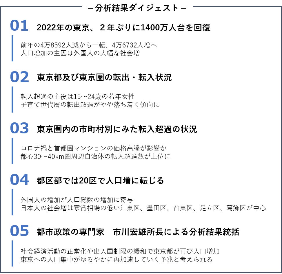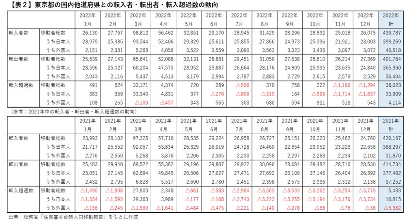 2022年における東京の人口の回復は外国人の増加で支えられた一方で、国内での東京回帰の流れもコロナ禍前の状況を取り戻しつつあります。コロナ禍を脱し、社会経済活動が安定化するとみられる2023年は、東京への人口集中が再加速していくものと考えられます。