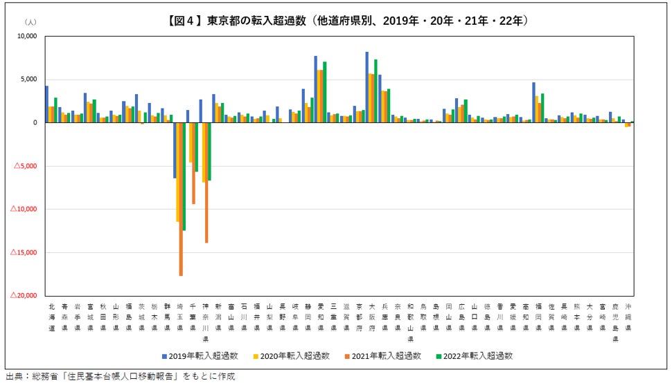 2021年との比較では、これら隣接3県での転出超過数が大幅に低下し、他の道府県のうち39道府県(長野県、島根県、佐賀県、宮崎県のみ少人数の減少)で転入超過数が拡大していることがみてとれます【図4】。