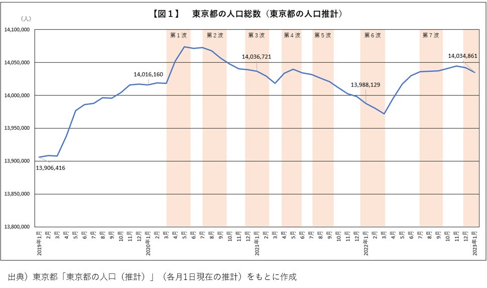 2022年の東京都の人口動向は、前年12月に始まった新型コロナ感染拡大「第6波」の影響で1月の1398万8129人から減少を続け、3月には1397万2039人まで低下しました。しかしこの「第6波」で主流となったオミクロン株は重症化割合が比較的少なく、ワクチンの追加接種も行きわたるようになり、4月に2万3430人増、5月に2万1477人増、6月に1万2780人増と、人口は急速に増加し続けました。7月からの感染拡大「第7波」によって8月、9月はほぼ横ばいとなりますが、10月以降は再び増加に転じ、11月には1404万4538人まで回復しました。その後、「第8波」の影響により若干の減少となりますが、2023年1月時点の総人口は1403万4861人となっています。
