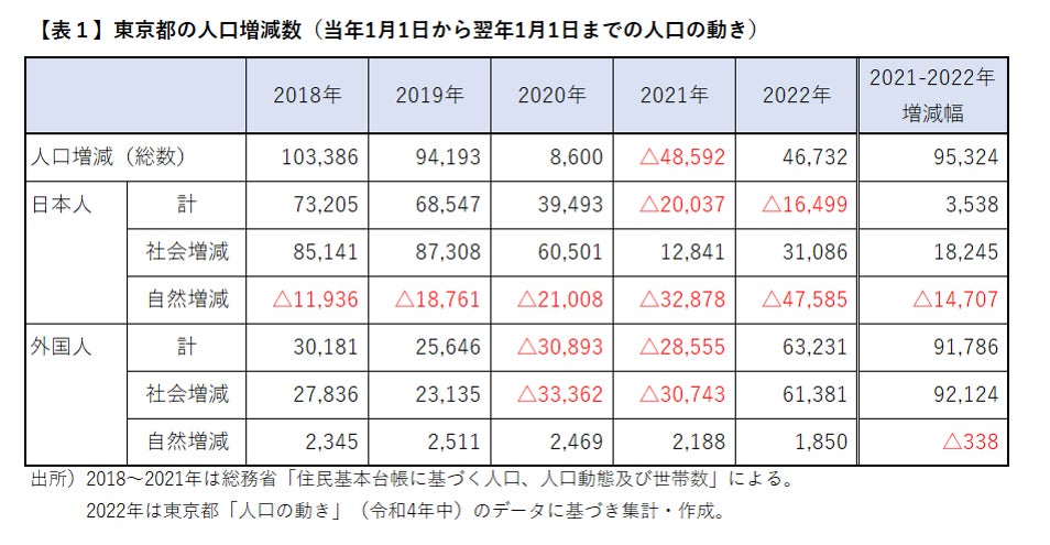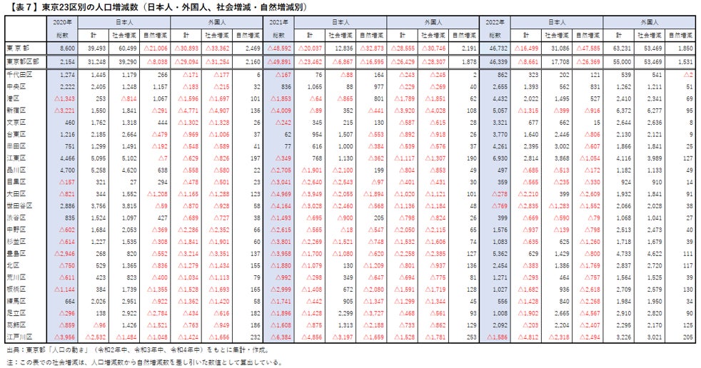 2022年は社会経済活動の正常化や出入国制限の緩和が徐々に進み、東京都の人口は外国人の大幅な増加によって回復を遂げました。日本人については、社会増減数ではコロナ禍前の3分の1水準のプラスと回復傾向にありますが、自然増減数での大幅なマイナス(出生者数の低下と死亡者数の拡大)によって、結果的に日本人総数は前年よりも減少してしまいました。社会増減数の回復は喜ばしいところですが、コロナ禍による痛手がまだ続いていることが読み取れます。