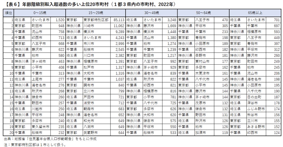 また、東京圏内の市町村別にみた転入超過の状況では、若年層では東京特別区部が圧倒的に多く、子育て層が多く占める30~40歳代では、さいたま市、横浜市、千葉市のほか、都心30~40km圏周辺の東京近郊を選択していることも分かりました。