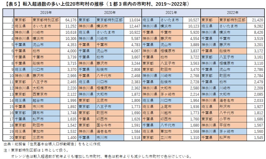 ここで、東京圏(1都3県)内でどの市町村に人口が集まっているのか、すなわち転入超過数が多いのかをみていきます。以下は、2019年から22年にかけての転入超過数の多い上位20市町村の推移の表です【表5】。