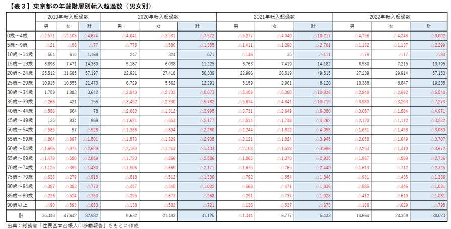 この東京都の転入・転出状況を年齢5歳階級別・男女別に分けてみていきます【図3・表3】。東京都には進学や就職などの要因で15~19歳、20~24歳、25~29歳の3つの年齢階級が多く転入し、転入超過数に大きく寄与しています。これら3つの年齢階級(15~29歳の若年層)の転入超過数の推移をみると、コロナ禍前2019年には9万3036人の転入超過でしたが、2020年に7万3855人、2021年に7万1817人と、その数は2019年の8割程度に低下しました。2022年には9万183人の転入超過とコロナ禍前のほぼ同水準まで回復しています。