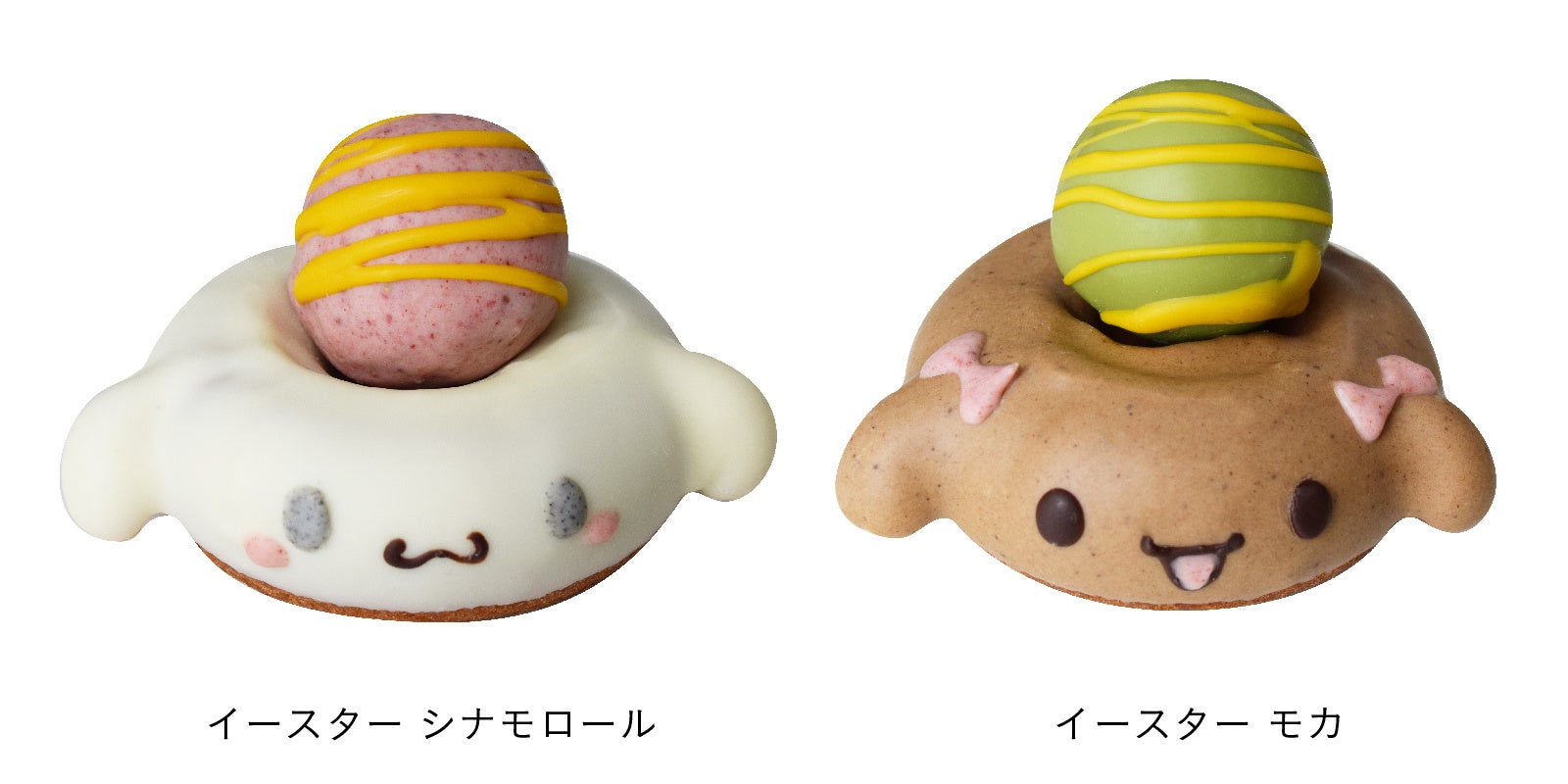 そして第2弾は、イースターエッグをあたまに乗せた、キュートなシナモロールとお友だちのモカがリングドーナツになって登場!モカのお顔は、有機コーヒーパウダーをホワイトチョコレートに混ぜた、カフェラテ味となっています♪