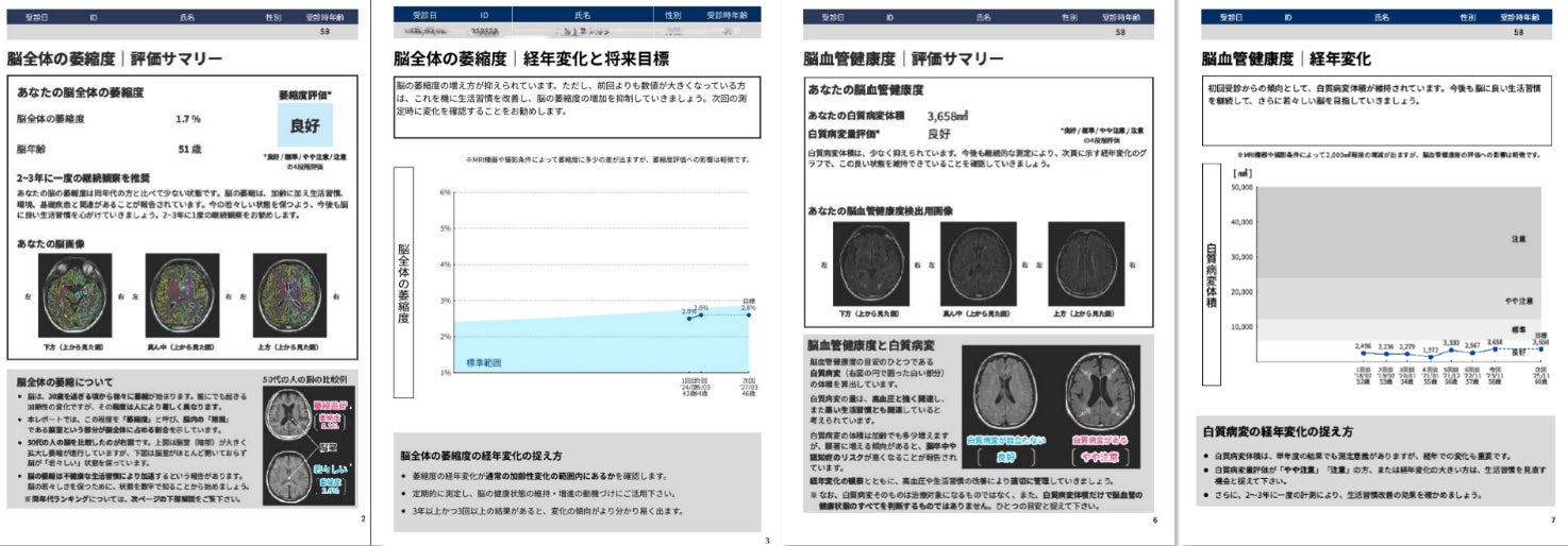 検査結果レポートはスマート脳ドックのMRI画像を使用して生成され、受診者は過去のデータとの経年比較が可能です。
