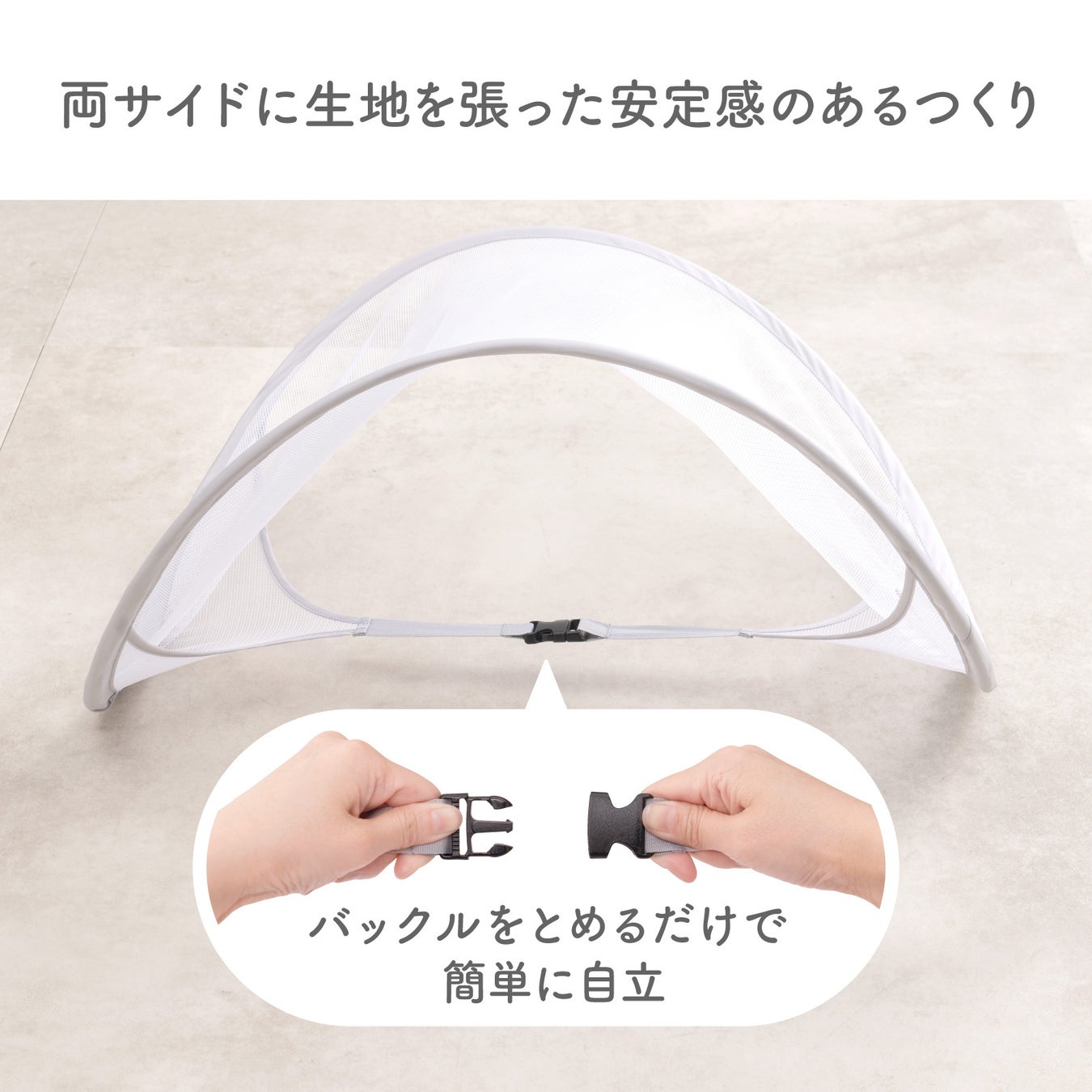 広げてバックルを止めるだけですぐに使用できます。両サイドに生地を張った安定感のあるつくりになっています。
