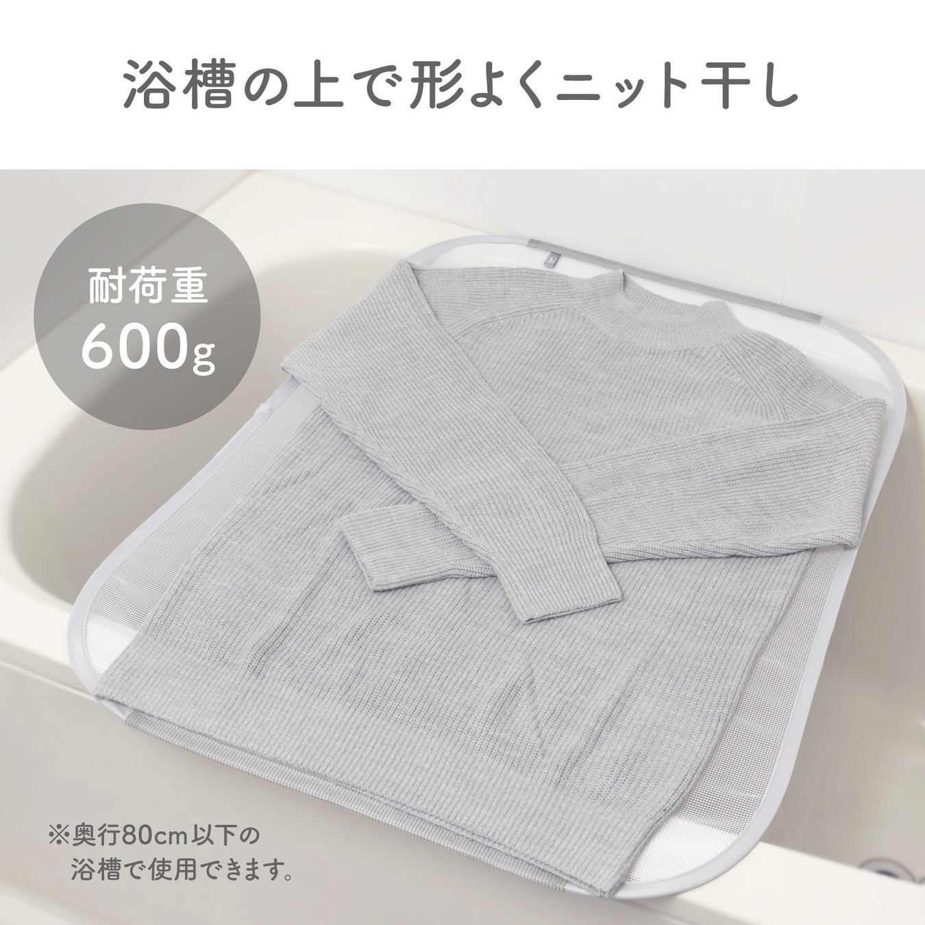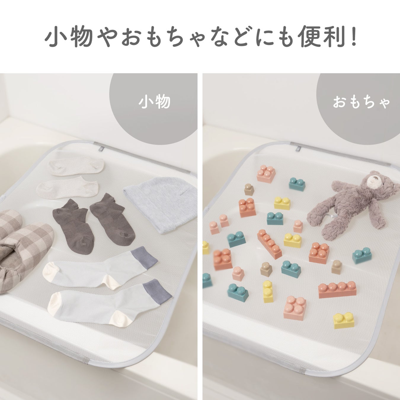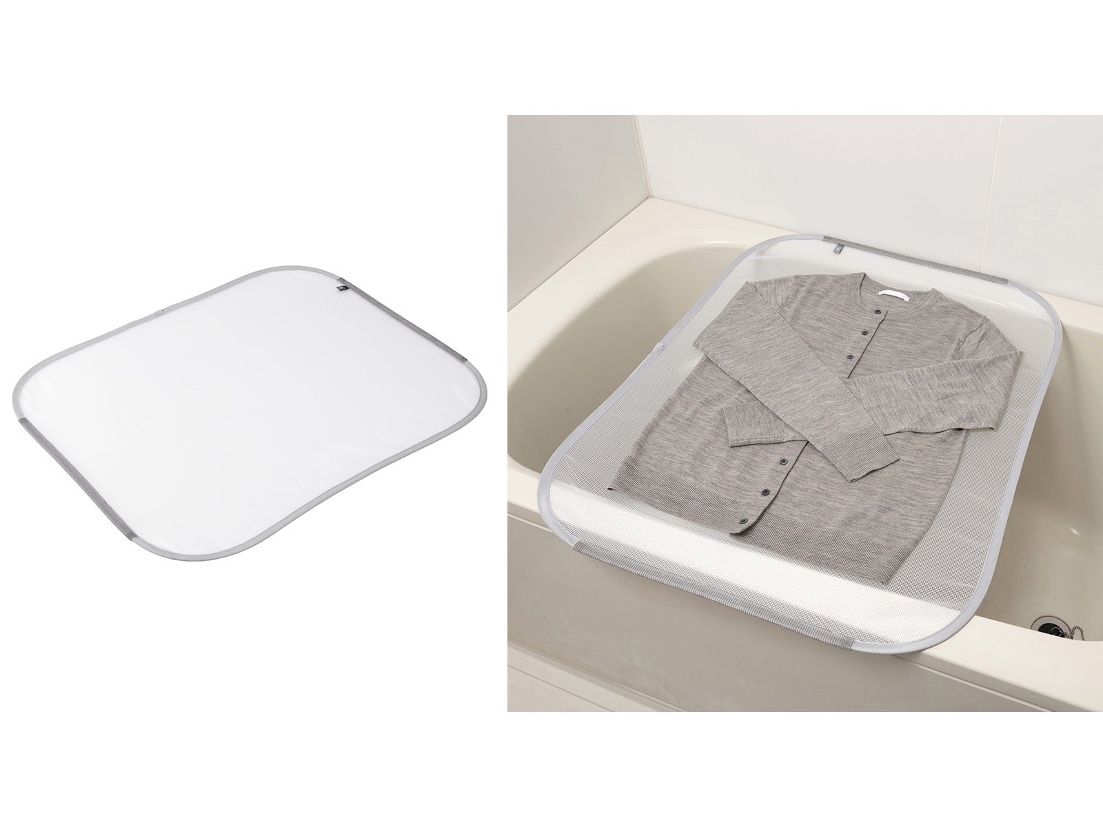 『フランドリー・平干しネットお風呂用』は、浴槽の上で平干しができます。組み立て不要で、広げて置くだけですぐに使用できます。浴槽との接触部には横滑りや傷を防ぐ滑り止めが付いています。浴室内なので、落ちてくる水滴が気にならず小物やおもちゃの乾燥にも最適で、2枚並べるとロングニットにも対応します。