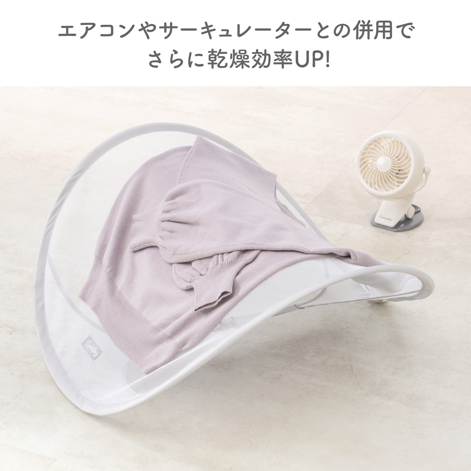 『フランドリー・平干しネットお部屋用』は、お部屋の空いているスペースで平干しができます。広げてバックルを止めるだけですぐに使用できます。両サイドに生地を張った安定感のあるつくりになっていて、立体アーチ形状なので、お部屋の中でも衣類を風通し良く干すことができます。