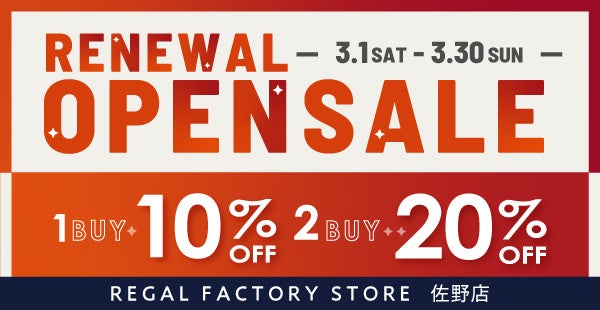 リニューアルオープンを記念して3月1日(土)~30日(日)の期間中、靴全品が通常のアウトレット価格より、1足で10%OFF、2足以上で20%OFFにてお買い上げいただけます。
